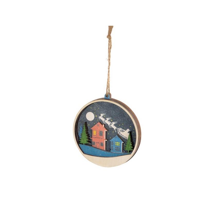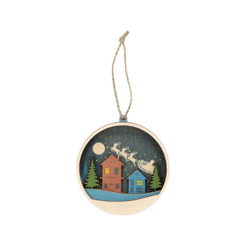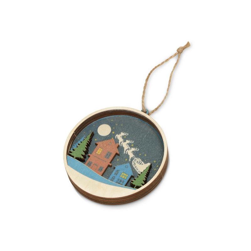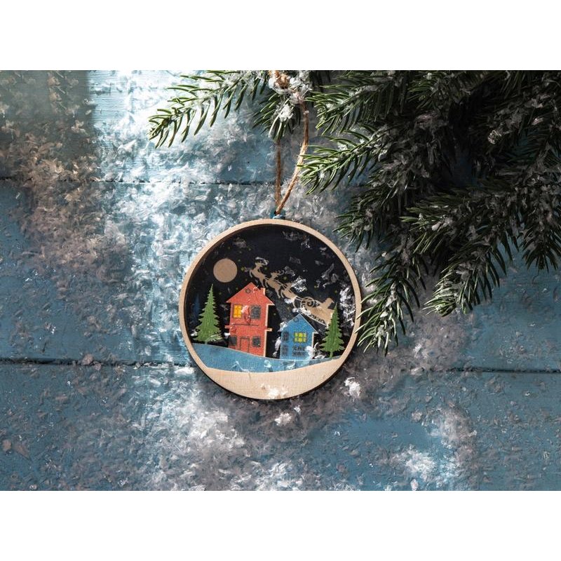Новогодняя игрушка выполнена из трех слоев фанеры, домики, небо и елочки, изображенные на ней, расположены на разных уровнях, что позволяет создать выпуклый рельеф. Весь зимний пейзаж выглядит объемно, создавая праздничное настроение.