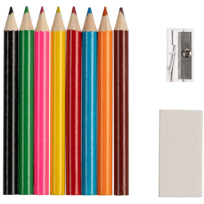 8 цветных карандашей и точилка с ластиком в пенале с карабином, который можно пристегнуть к рюкзаку или сумке.