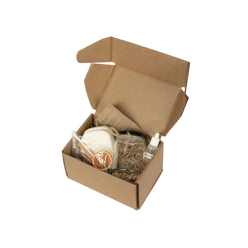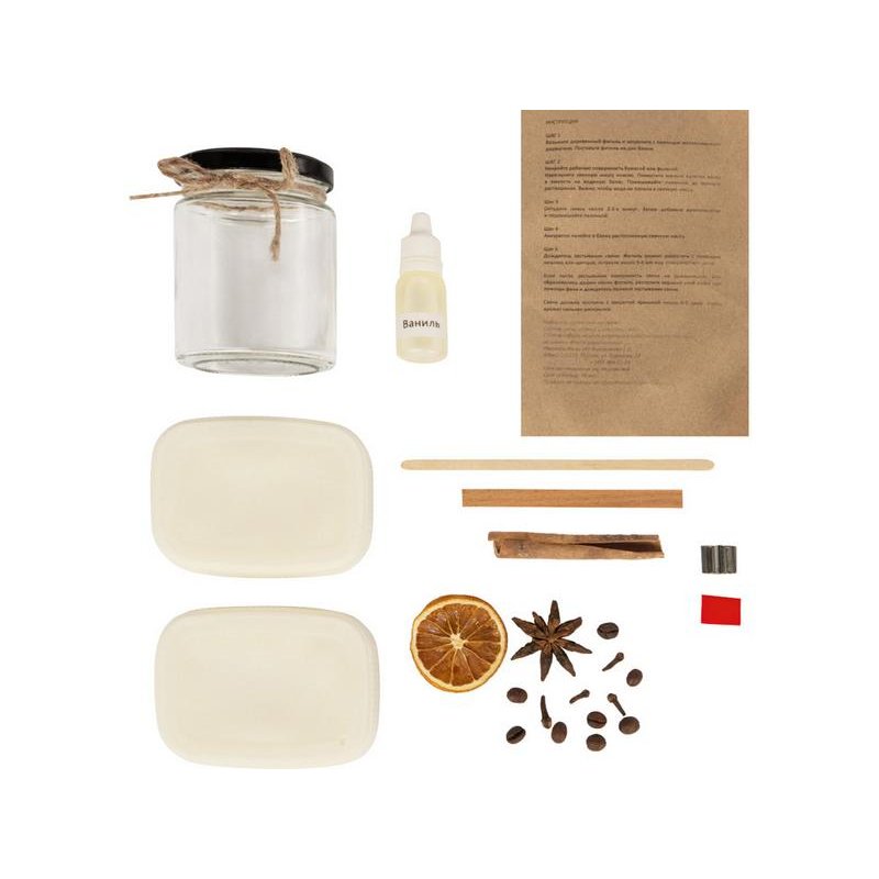 В набор входят сама свечная масса экологичного состава (соевый и кокосовый воск, пищевой парафин), стеклянная банка, деревянный фитиль и держатель, ванильный ароматизатор, специи и ленточка для декора.