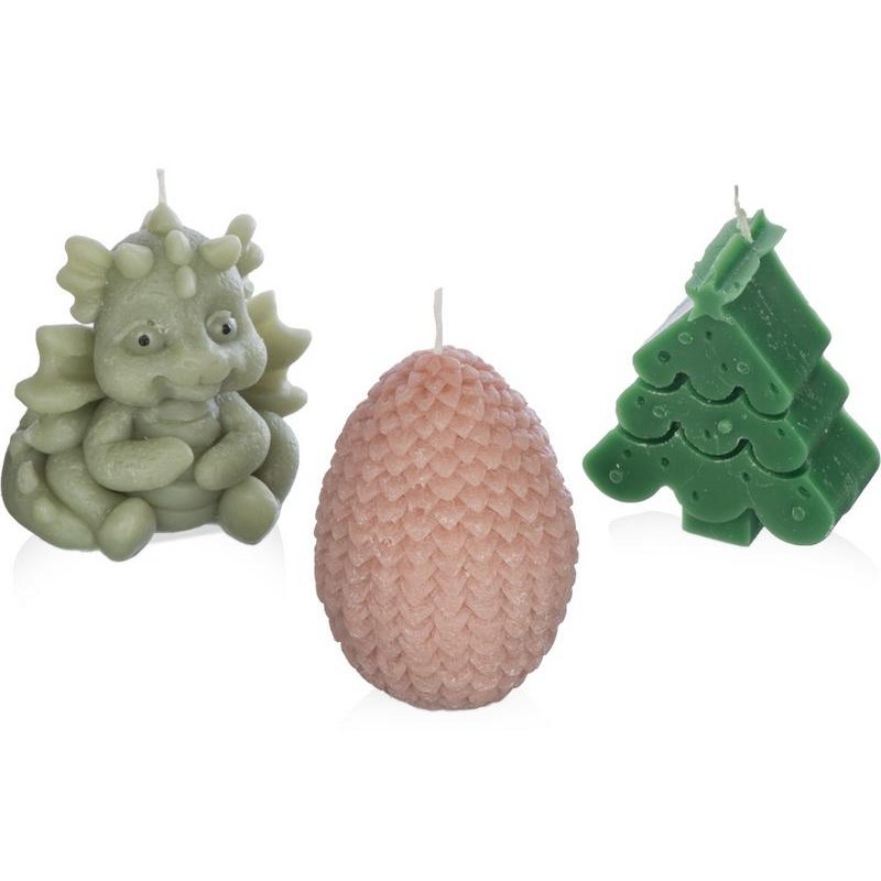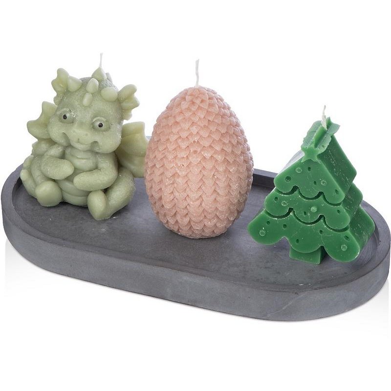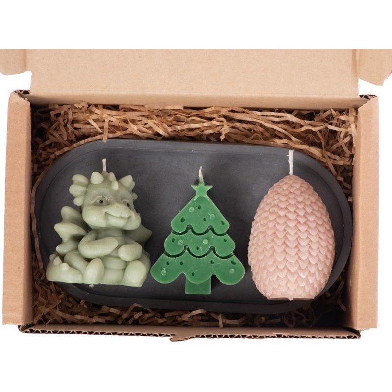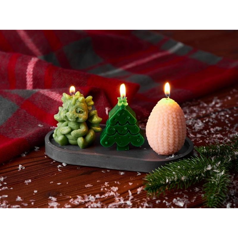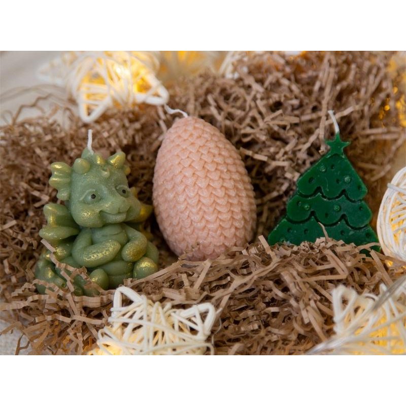 В набор входят три свечи на подставке — милый дракончик, яйцо и ёлка. Они подарят новогоднее настроение и ещё долго будут напоминать про год Дракона.