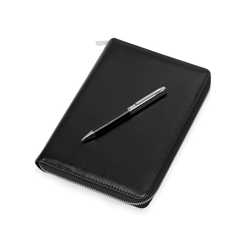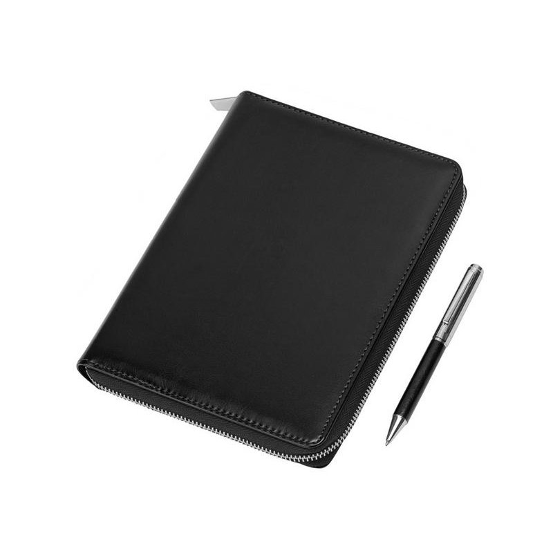 Бизнес блокнот Fabrizio состоит из пенала на молнии выполненного из искусственной кожи, и сменной тетради на 80 листов на кольцах с перфорированными линованными листами белого цвета.