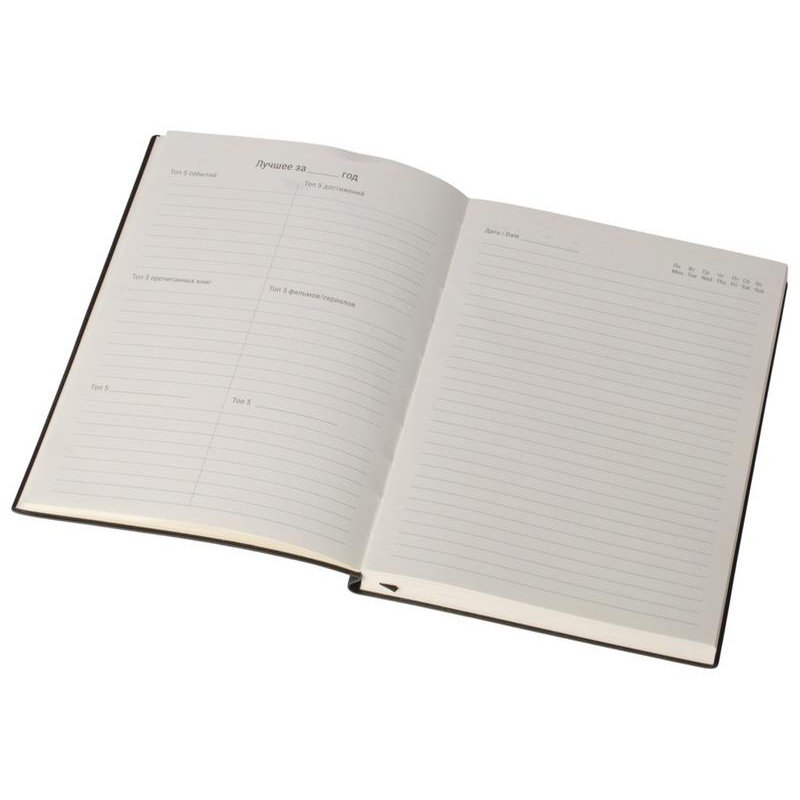 Бумажный блок выполнен из бумаги, полученной из древесины из специальных восполняемых лесных ресурсов, имеет сертификат FSC, международной некоммерческой организации лесного попечительского совета. Линовка — недатированный ежедневник, а на первых страницах вы встретите специальные листы для постановки целей на год и подведения итогов, а также другие трекеры.