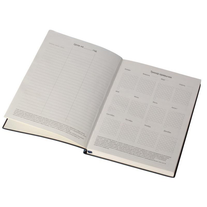 Бумажный блок выполнен из бумаги, полученной из древесины из специальных восполняемых лесных ресурсов, имеет сертификат FSC, международной некоммерческой организации лесного попечительского совета. Линовка — недатированный ежедневник, а на первых страницах вы встретите специальные листы для постановки целей на год и подведения итогов, а также другие трекеры.