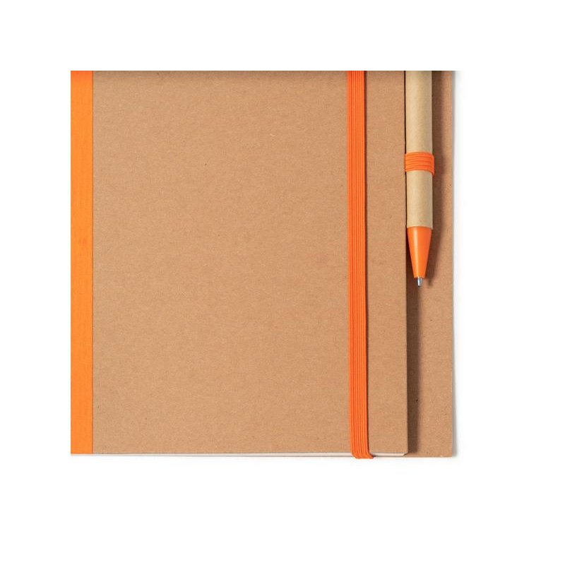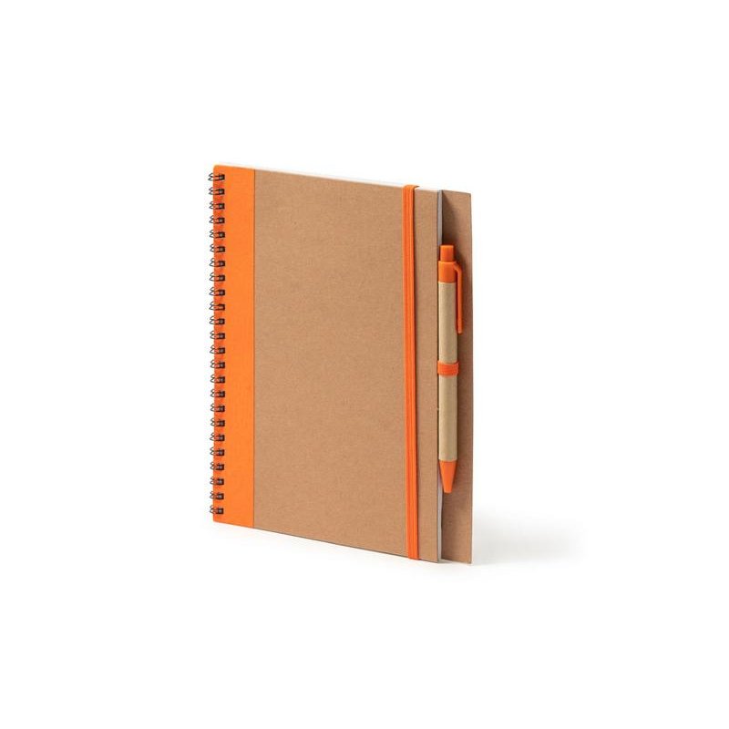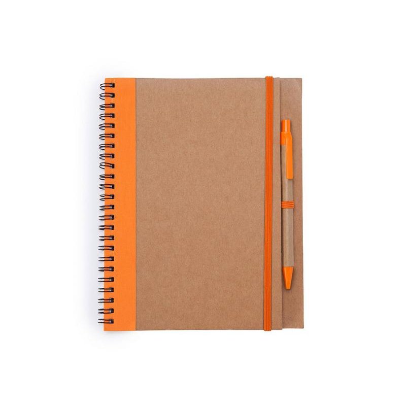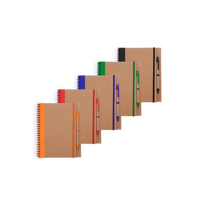 Блокнот на спирали с жесткой обложкой из переработанного картона. Включает шариковую ручку с синими чернилами. 60 простых листов.