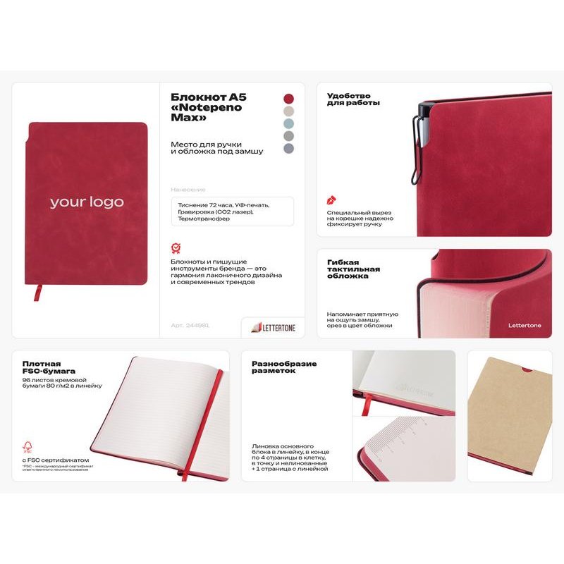 Внутри блокнота 96 листов кремовой бумаги повышенной плотности 80 г/м2 с FSC сертификатом.