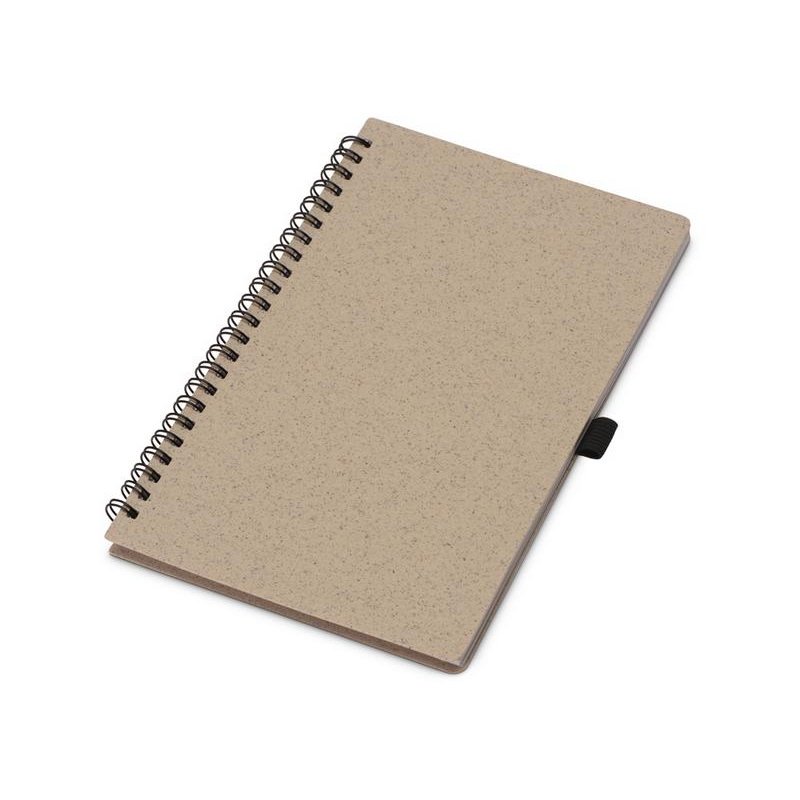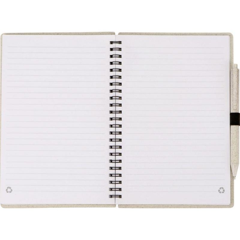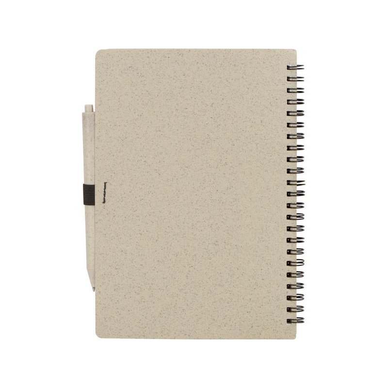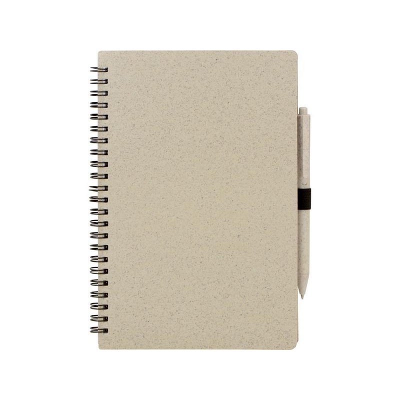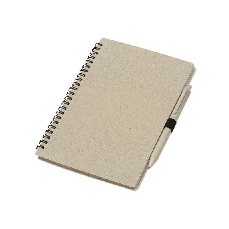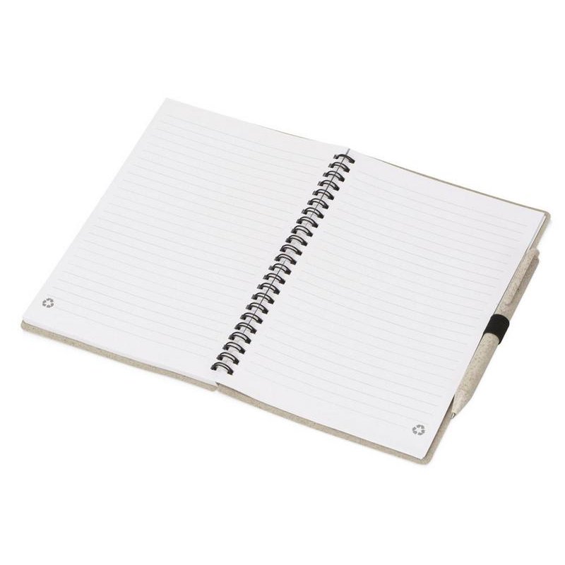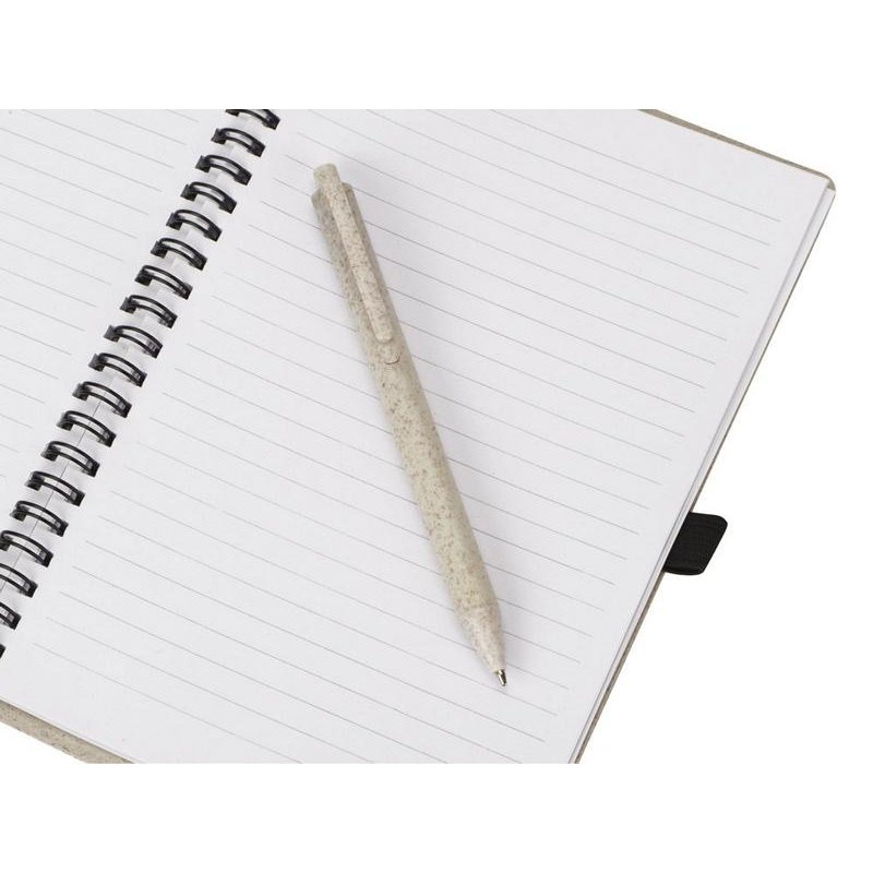 Блокнот с обложкой из переработанной пшеницы и пластика. Блок состоит из 80 листов переработанной бумаги белого цвета. Крепление - пружина. В комплекте шариковая ручка в тон блокноту из пшеничной соломы.