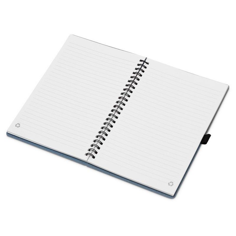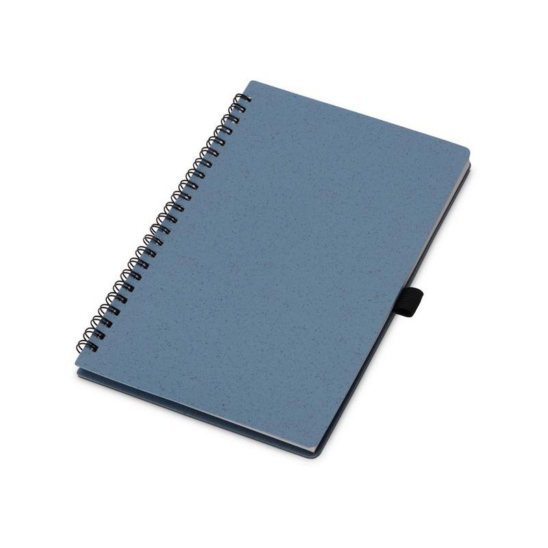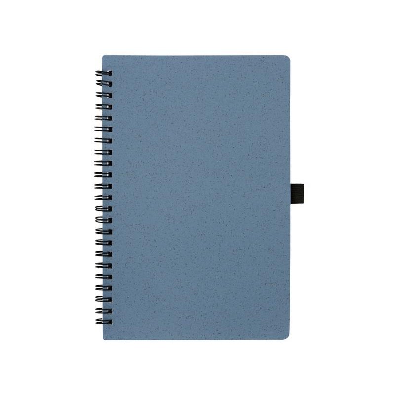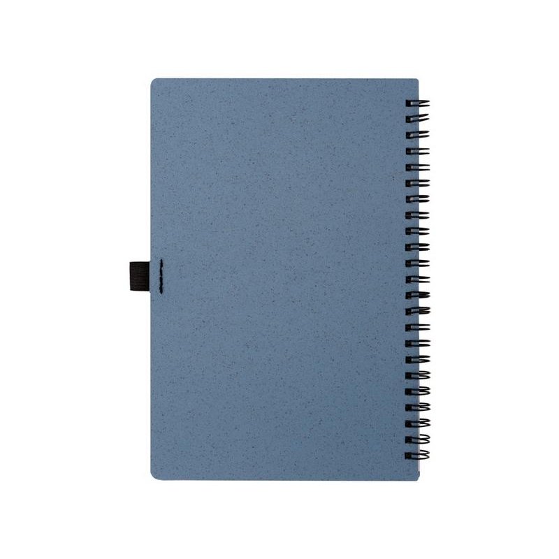 Блокнот с обложкой из переработанной пшеницы и пластика. Блок состоит из 70 листов переработанной бумаги белого цвета. Крепление - пружина. Дополнен петлей для ручки.