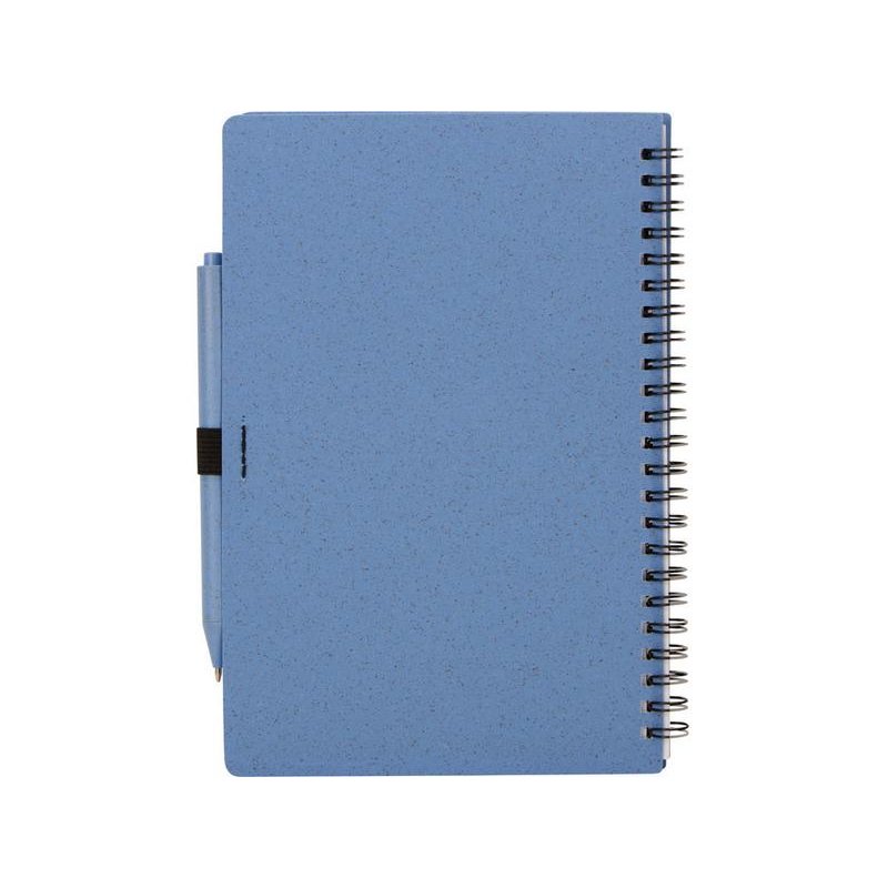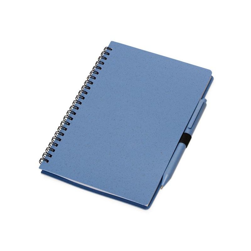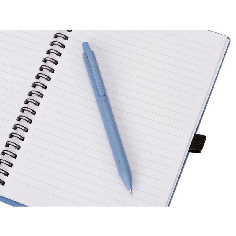 Блокнот с обложкой из переработанной пшеницы и пластика. Блок состоит из 80 листов переработанной бумаги белого цвета. Крепление - пружина. В комплекте шариковая ручка в тон блокноту из пшеничной соломы.