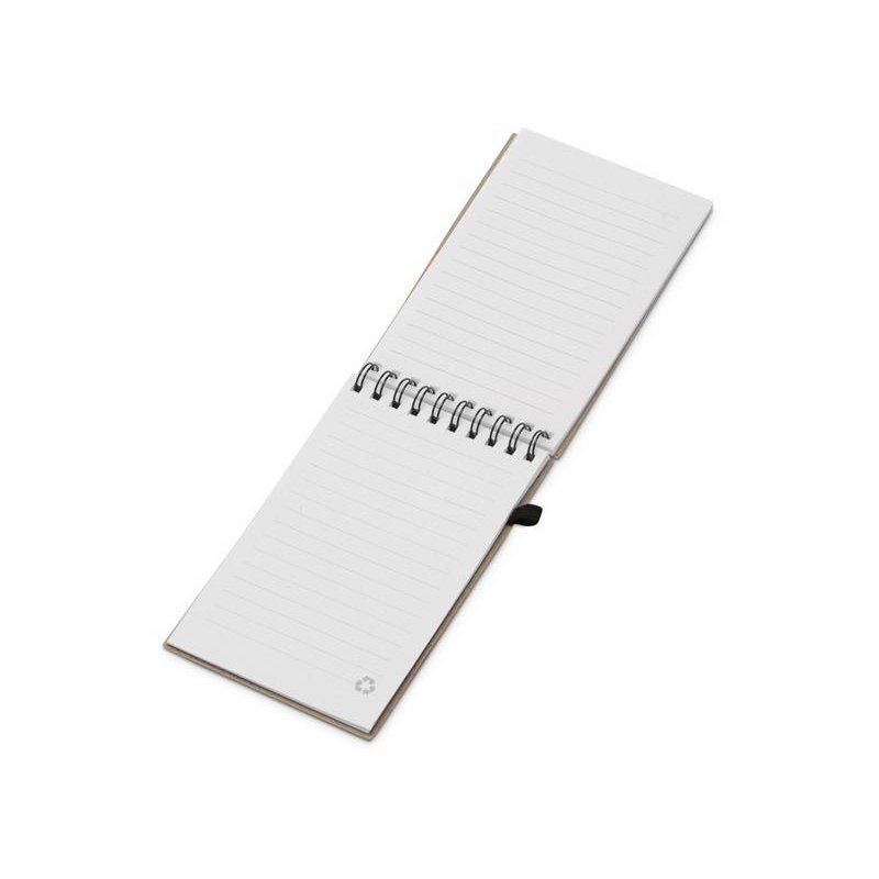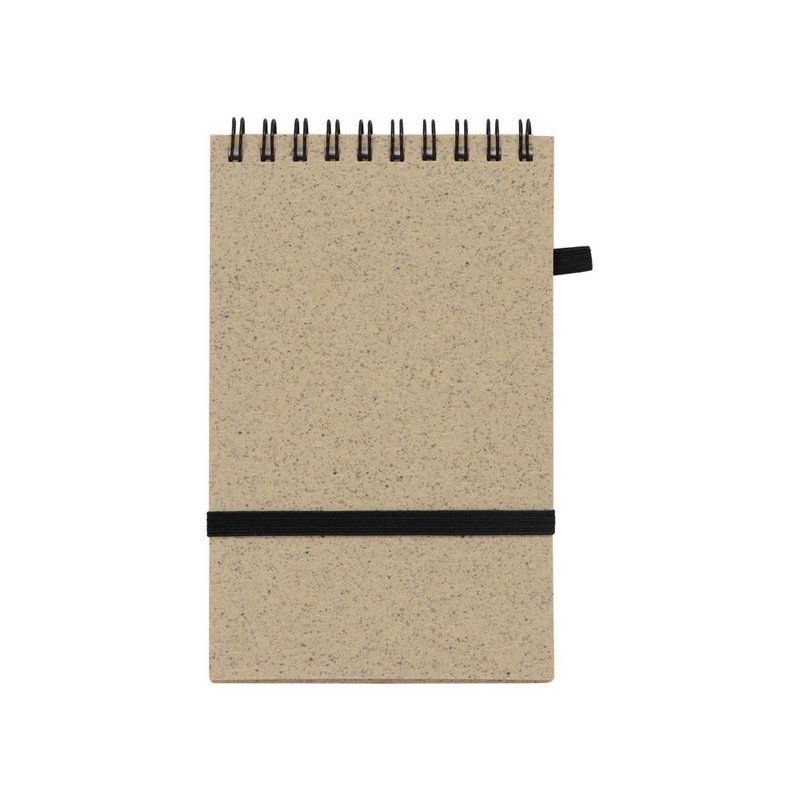 Блокнот с обложкой из переработанной пшеницы и пластика. Блок состоит из 60 листов переработанной бумаги белого цвета. Крепление - пружина. Дополнен петлей для ручкии горизонтальной резинкой.