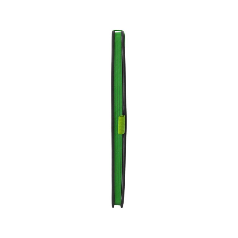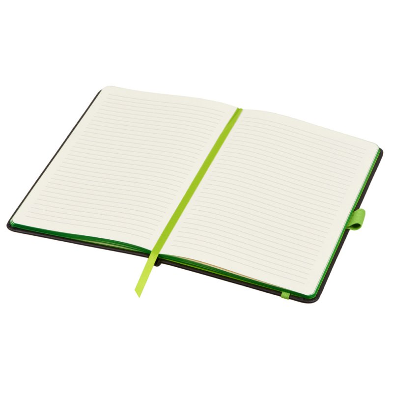 Блокнот в твердой обложке с закругленными углами черного цвета. Ляссе, резинка и срез яркого контрастного цвета делают его очень стильным и функциональным бизнес-аксессуаром.