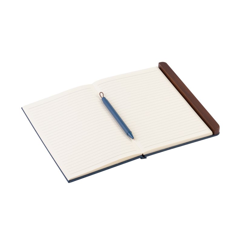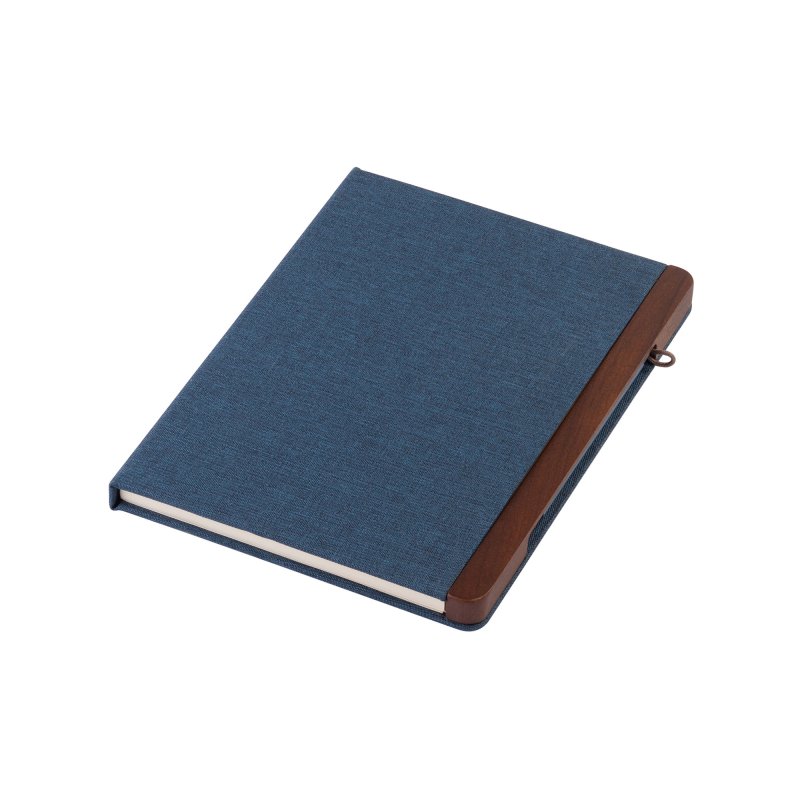 В блокноте 160 страниц в линейку кремовой бумаги плотностью 80 г/м2. Материал текстильной обложки изготовлен из переработанного (RPET) пластика. Ручка с синей пастой, стержень легко заменить.