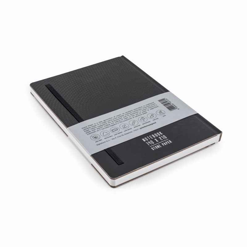 Тетрадь с листами из каменной бумаги. Дизайнеры Pininfarina создали элегантный дизайн для своего идеального дополнения к линейке вечных ручек Pininfarina Segno, так как именно на каменной бумаге они оставляют очень яркий след. Черная твердая обложка с принтом Pininfarina и покрытием soft-touch фиксируется резинкой того же цвета. Тетрадь размером А5 (14х21 см) содержит 64 листа в линейку. Листы сделаны из каменной бумаги, экологической альтернативы обычной целлюлозной бумаге, которая не требует вырубки деревьев, использования воды и агрессивных химических веществ, тем самым защищая окружающую среду. Она состоит из 80% камня (карбоната кальция) и на 20% из связующего его нетоксичного полиэтилена высокой плотности (HDPE). Это бумага нового поколения с уникальными характеристиками. Каменная бумага на 100% водоотталкивающая, ее можно мыть. Жидкости, включая масло, не изменяют ее структуру, поскольку она не содержит древесных волокон, которые поглощают жидкости, в следствие чего традиционная бумага покрывается пятнами, деформируется и разрушается. Каменная бумага устойчива к разрыву, что также способствует ее долговечности. Она имеет приятный бархатистый эффект и не отражает свет. Плотность бумаги 140 гр/м2. Сделана в Италии.