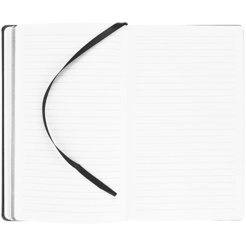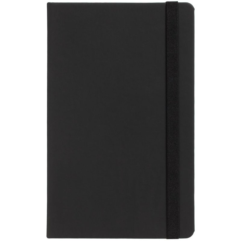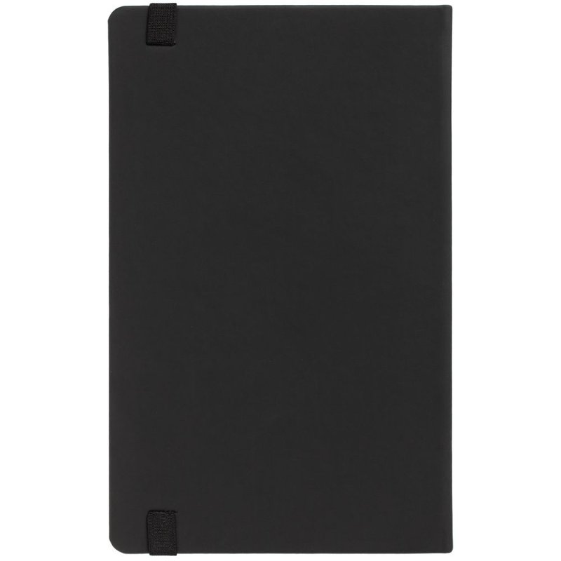 Блокнот в твердой обложке, выполнен из материала Soft Touch, черный АА, дополнен резинкой и ляссе в цвет обложки.