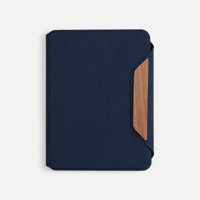 Обложка из ткани, на магнитной застежке с деревянной шильдой: