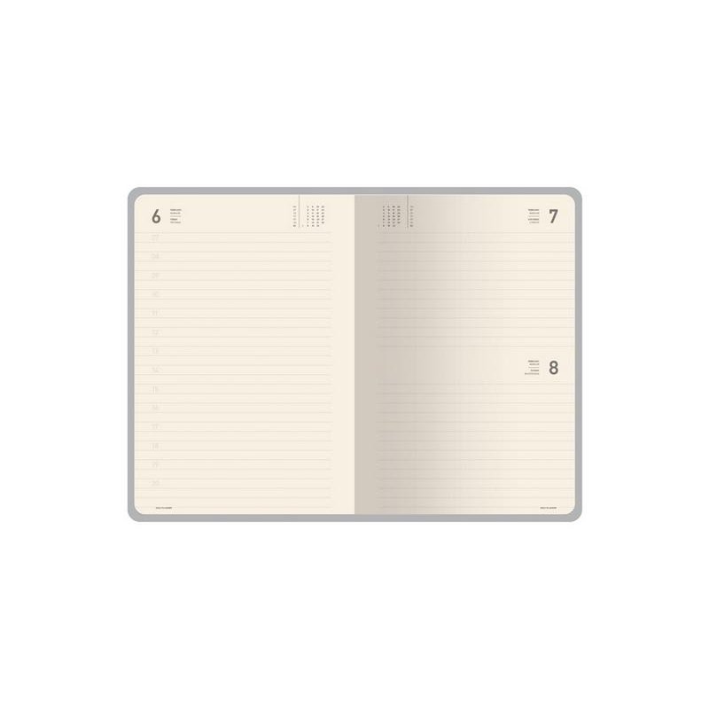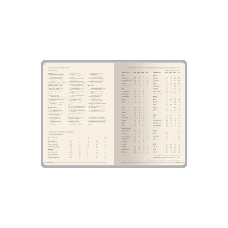 Внутренний блок выполнен из бежевой бумаги плотностью 70 г/кв.м и содержит 14 страниц справочной информации, а также датированные страницы с почасовой разметкой.