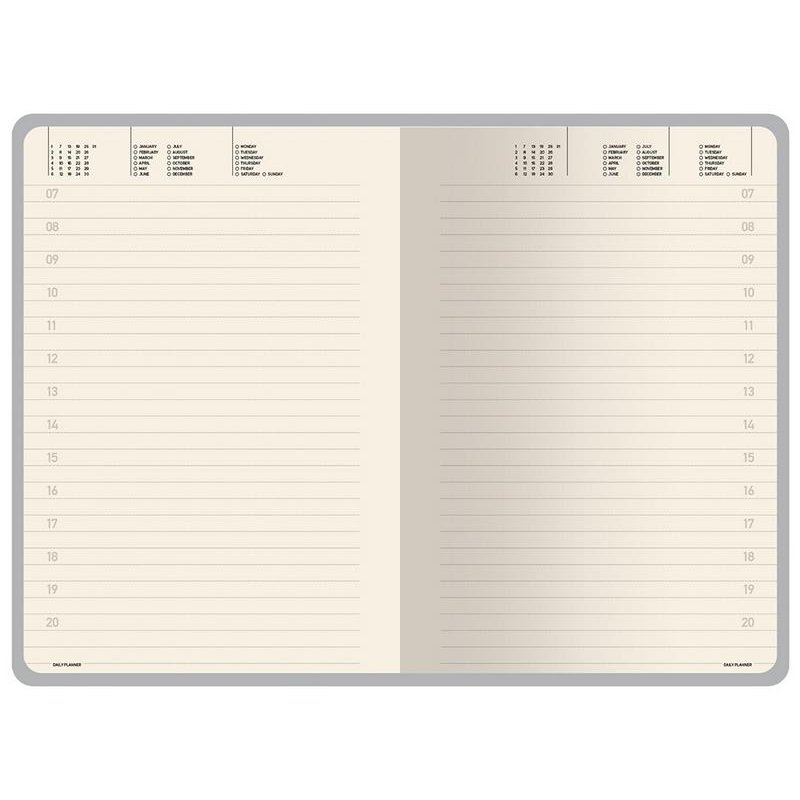 Недатированные страницы в серую линейку имеют отдельное место для проставления числа месяца и дня недели. Справочный блок на 17 страницах содержит полезную информацию из различных областей.