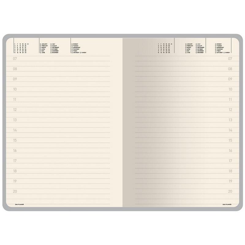 Недатированные страницы в серую линейку имеют отдельное место для проставления числа месяца и дня недели. Справочный блок на 17 страницах содержит полезную информацию из различных областей.