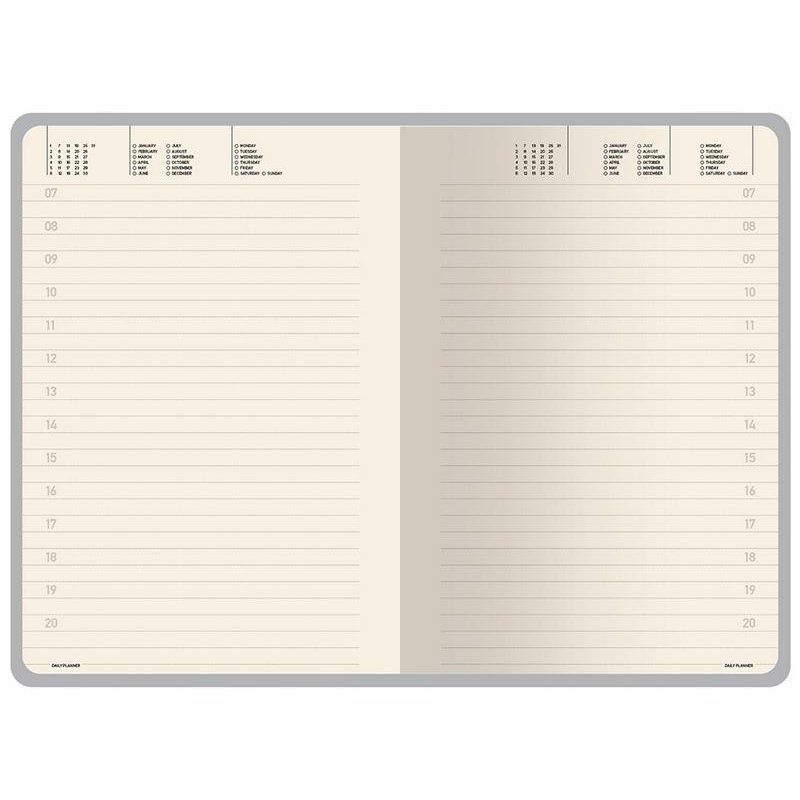 Недатированные страницы в серую линейку имеют отдельное место для проставления числа месяца и дня недели. Справочный блок на 17 страницах содержит полезную информацию из различных областей.