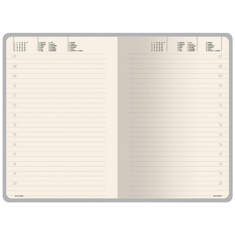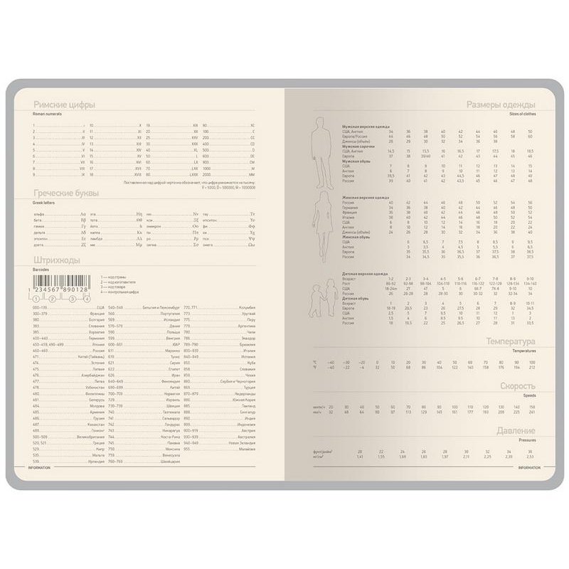 Недатированные страницы в серую линейку имеют отдельное место для проставления числа месяца и дня недели. Справочный блок на 17 страницах содержит полезную информацию из различных областей.