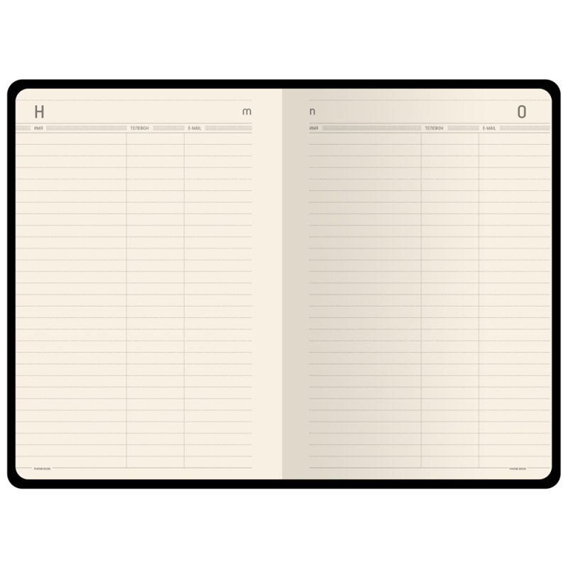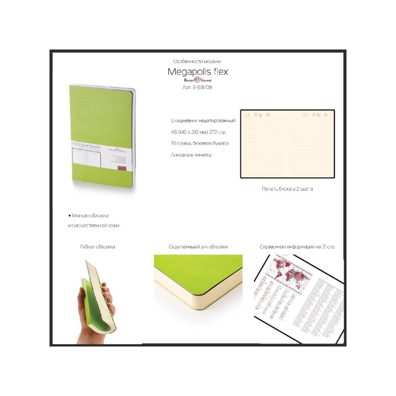 В ежедневнике Megapolis Flex есть полезная справочная информация и телефонная книга, а также страницы для записи идей, мыслей и составления рабочих планов. Для изготовления страниц используется качественный бежевый офсет повышенной плотности (70 г/кв м). Блок не привязан к конкретным датам – они указываются в выделенном поле вверху страницы. Тонированная бумага не дает глазам утомиться даже при длительной работе.