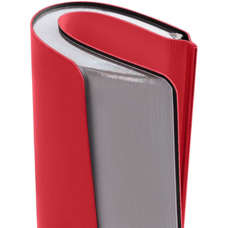 Ежедневник с гибкой обложкой и металлическим корешком, выполнен из материала Soft Touch Ultra, красный РР, дополнен серебристым обрезом блока и ляссе.