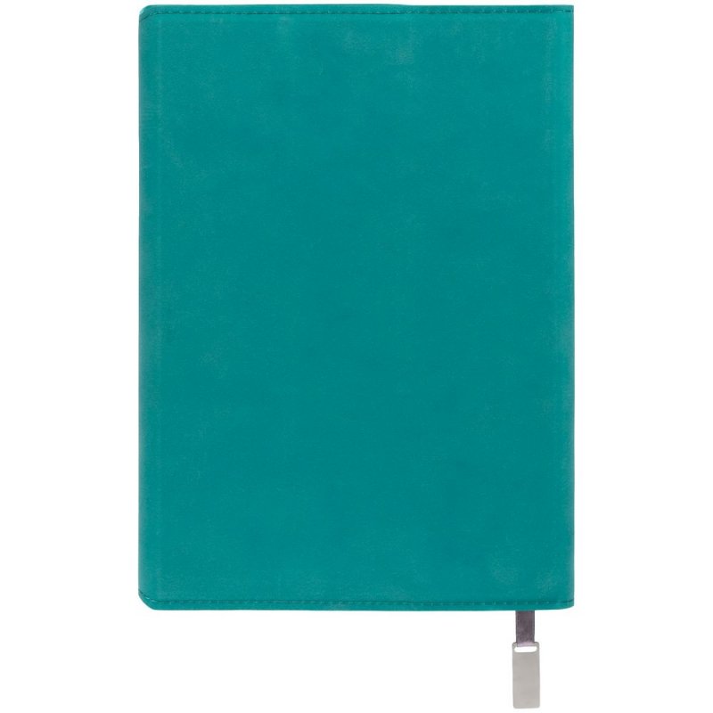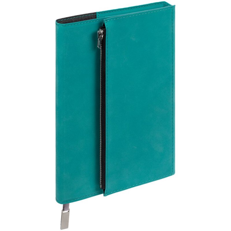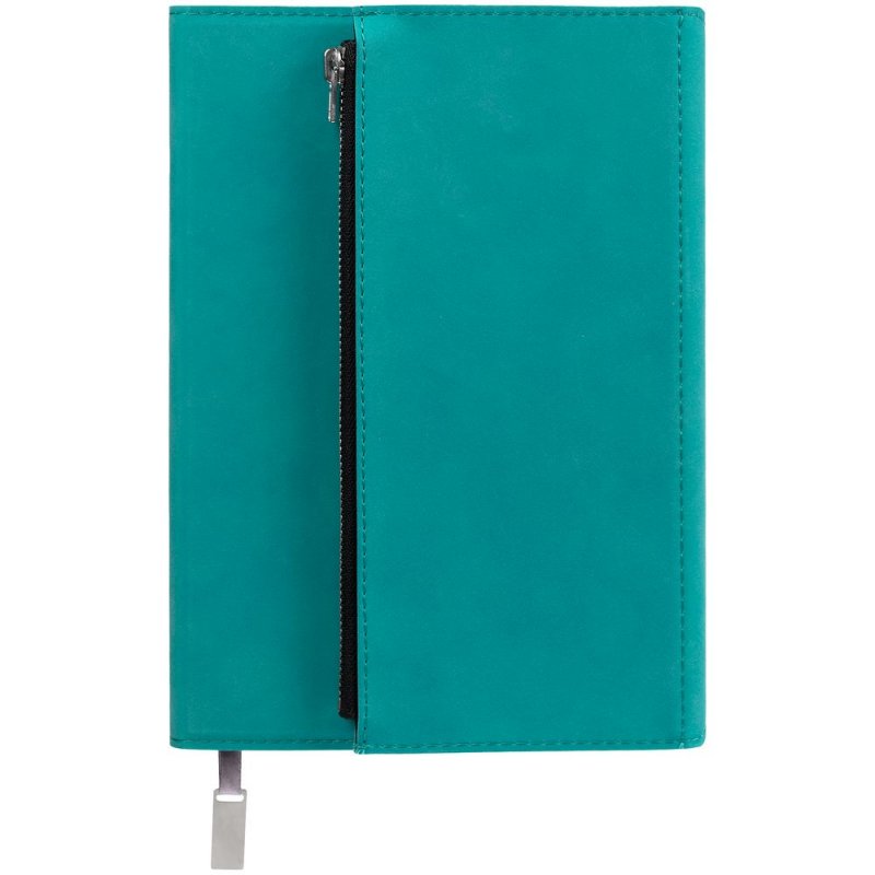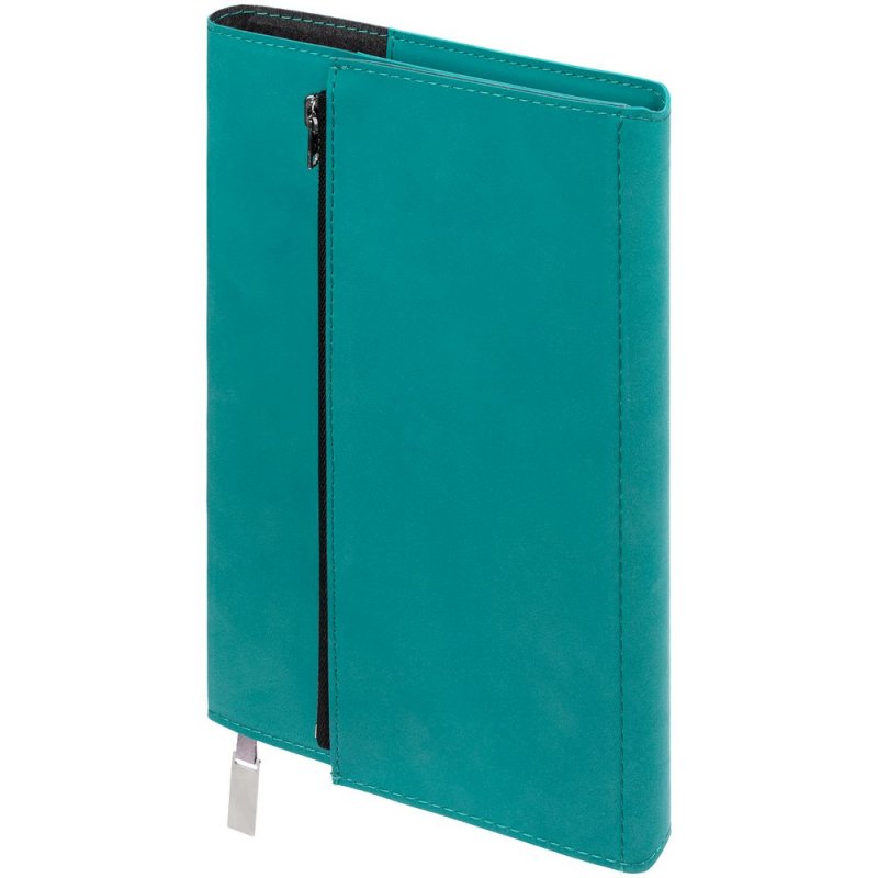 Ежедневник в гибкой суперобложке c карманом на молнии, выполнен из материала Nubuck, цвет морской волны II. Дополнен капталом и металлической шильдой на ляссе серого цвета.