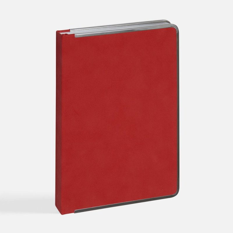 Ежедневник с твердой обложкой и серебристым обрезом блока. Выполнен из материала Nubuck, красный РР, дополнен красным ляссе и металлическими рамками с двух сторон обложки.