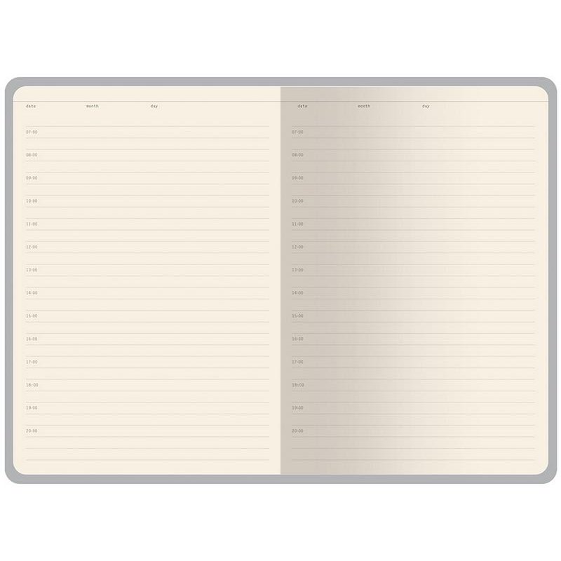 Бумажный блок, закрепленный книжным переплетом, выполнен из бежевой офсетной бумаги плотностью 70 г/ кв м. Внутри блока есть страница для персональных данных, справочная информация на 13 страницах. Блок для записей имеет линовку с указанием временных интервалов в один час.
