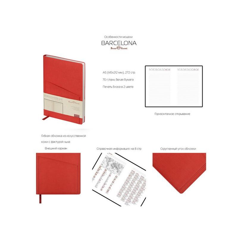 Это ежедневник предназначен для тех, кто отдает предпочтение строгости. Телефон, ручка, визитки и листы для записей будут всегда под рукой благодаря удобному карману на фронтальной стороне. В недатированном ежедневнике Barcelona красного цвета используется белая бумага плотность 70 г/м. Ляссе благородного бордового цвета сочетается с обложкой. Скругленный угол - фирменная особенность ежедневников Bruno Visconti. Справочная информация на 8 страницах. Ежедневник Barcelona упаковывается в картонный полукороб и термопленку.