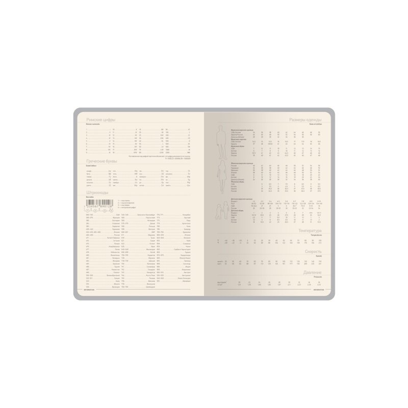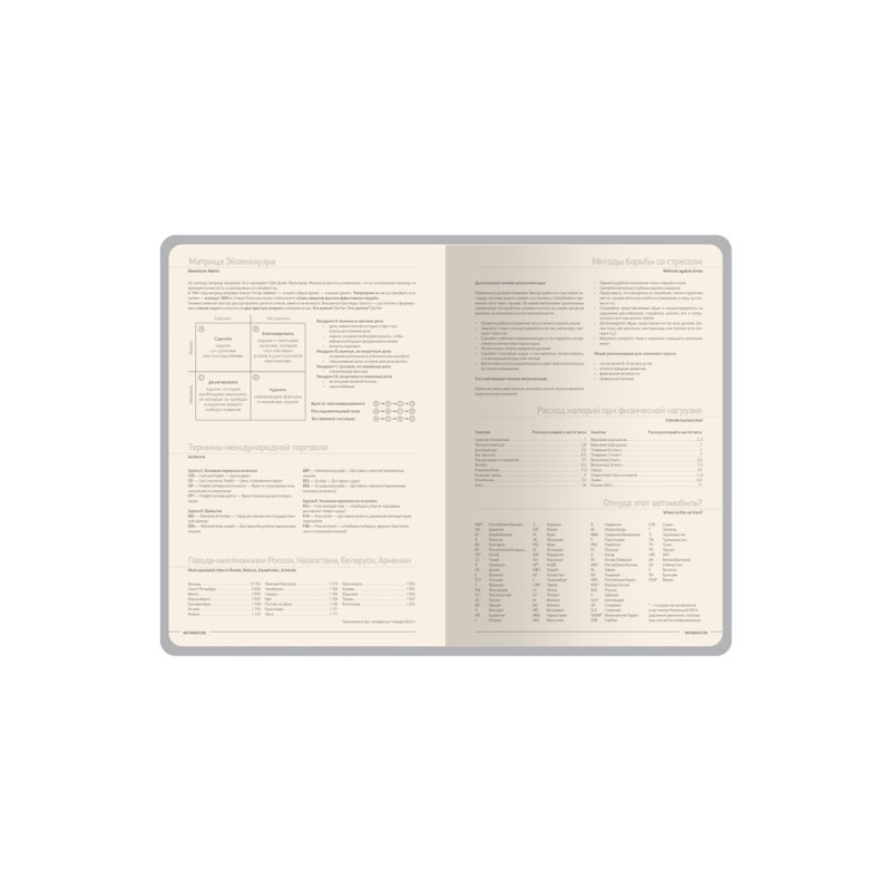 Блок изготовлен из бежевой бумаги плотностью 70 г/м2 и помимо раздела для планирования рабочего времени включает в себя 12 страниц справочной информации.