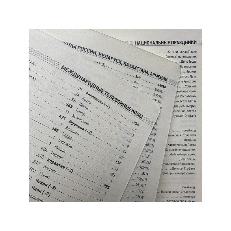 •справочная информация на 19 страницах (аэропорты Европы, штрихкоды, международные телефонные коды, цифровые автомобильные коды, энергетическая и питательная ценность продуктов, национальные и религиозные праздники, единицы измерения, страны мира, размеры одежды, форматы бумаги и др.);