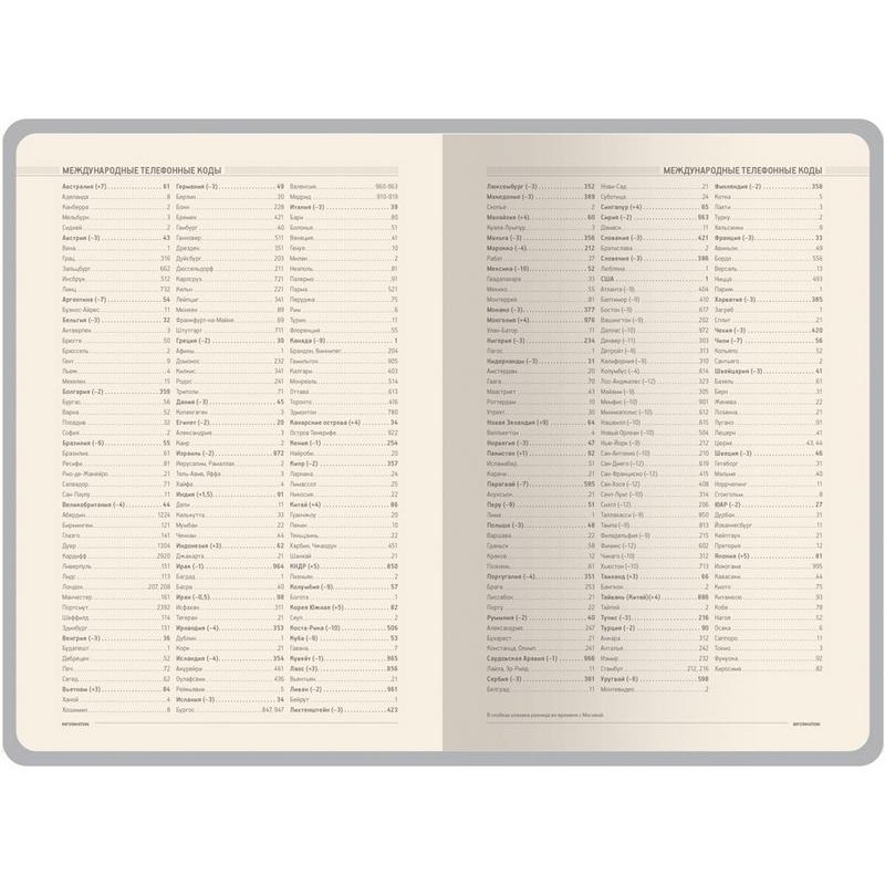 •19 страниц справочной информации (телефонные коды, буквенные коды, города-миллионники, автомобильные коды, энергетическая и питательная ценность продуктов, национальные праздники, скорость, давление, температура, страны мира, единицы измерения, штрихкоды, термины международной торговли, греческие буквы, размеры одежды, формат бумаги, религиозные праздники, аэропорты Европы, допустимое содержание алкоголя в крови, время распада алкоголя в крови);