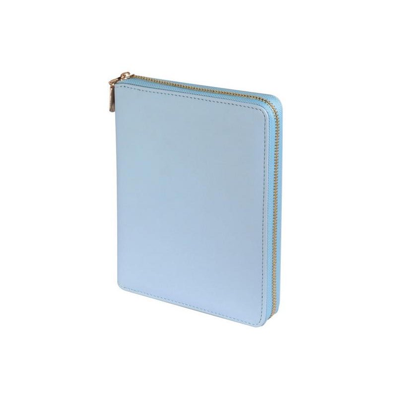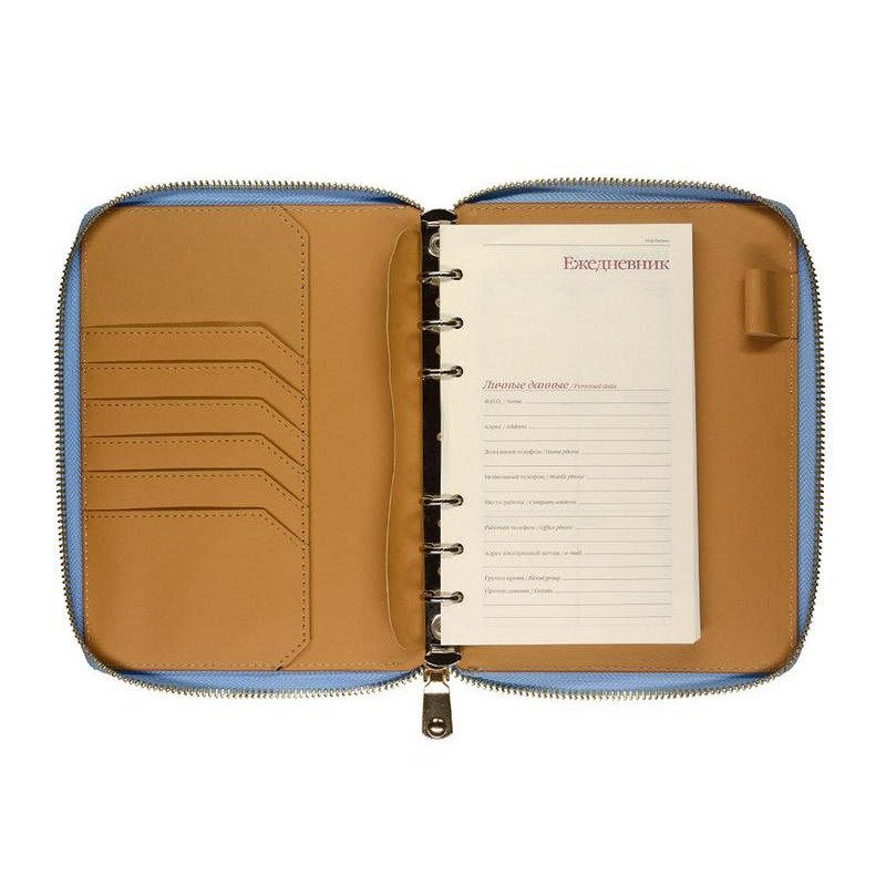 Деловая нежность! Вот как можно охарактеризовать этот очаровательный зефирно-голубой ежедневник. Большое отделение на молнии вмещает в себя и сменный блок для записей на кольцевом механизме, и отделения для визиток и ручки. В этом бизнес-аксессуаре поместятся и дополнительные документы и смартфон.
