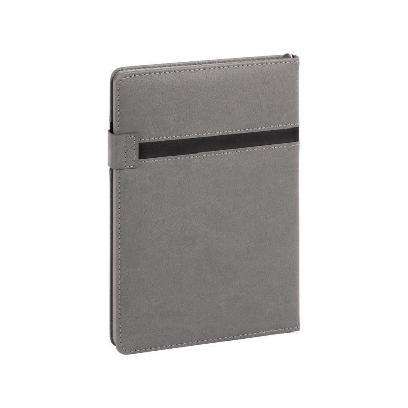Матовая плотная обложка с выраженной текстурой натуральной кожи дополнена стильным вырезом – полосой серого цвета с прошивкой по периметру. Внутренний блок включает 256 страниц из бумаги плотностью 70 гр., срезом в цвет обложки и закладкой-ляссе, благодаря которой его удобно сразу открывать на нужной странице.