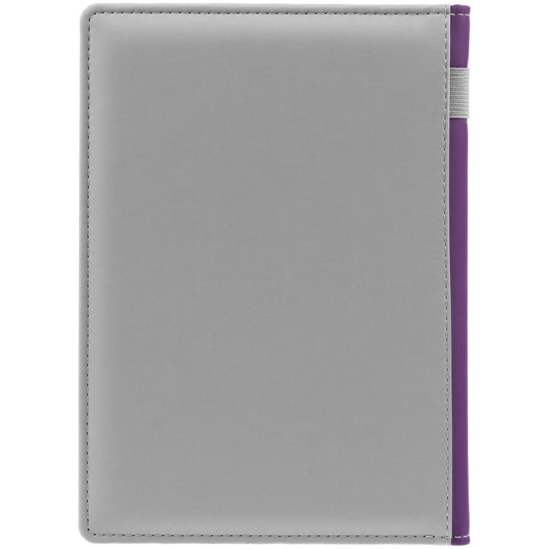 Твердая обложка с поролоном, материал обложки — Soft Touch, серый СС и Soft Touch, фиолетовый UU. На корешке ежедневника находится петля из резинки.