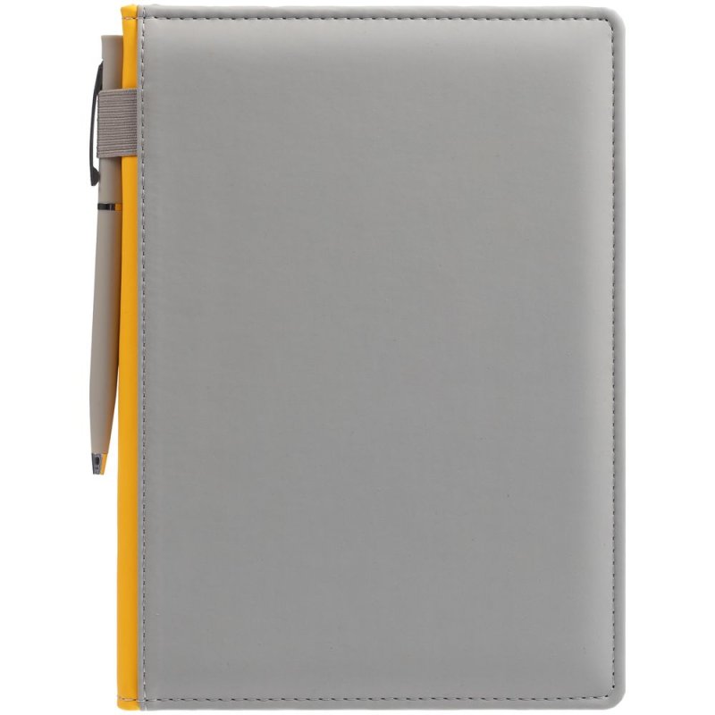 Твердая обложка с поролоном, материал обложки — Soft Touch, серый СС и Soft Touch, желтый КК. На корешке ежедневника находится петля из резинки.