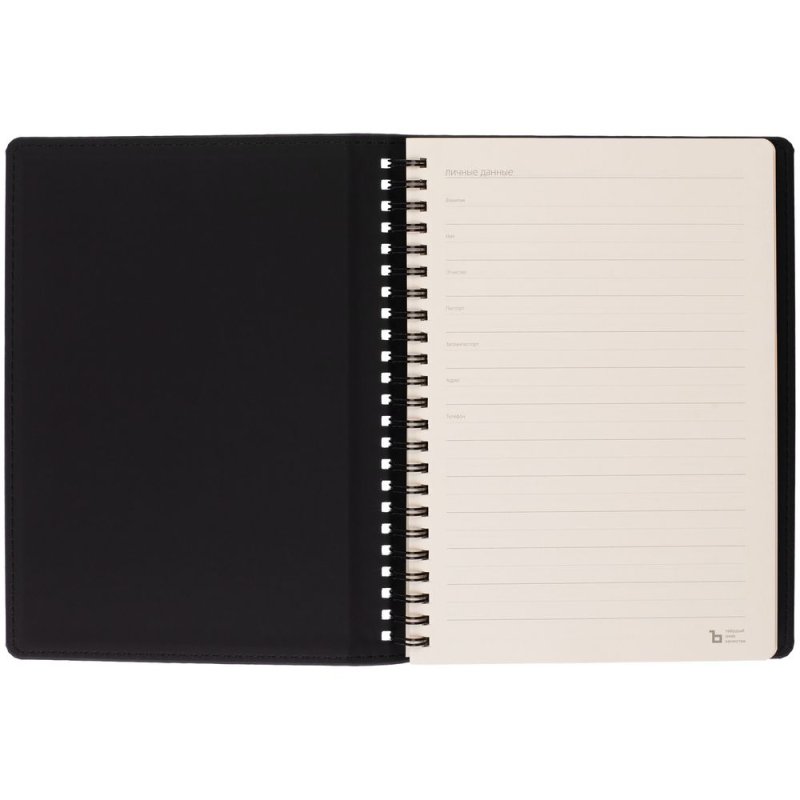Ежедневник с блоком на пружине в твердой обложке, выполнен из материалов Nubuk Touch, черный AA и Soft Touch, черный AA.