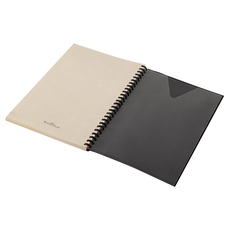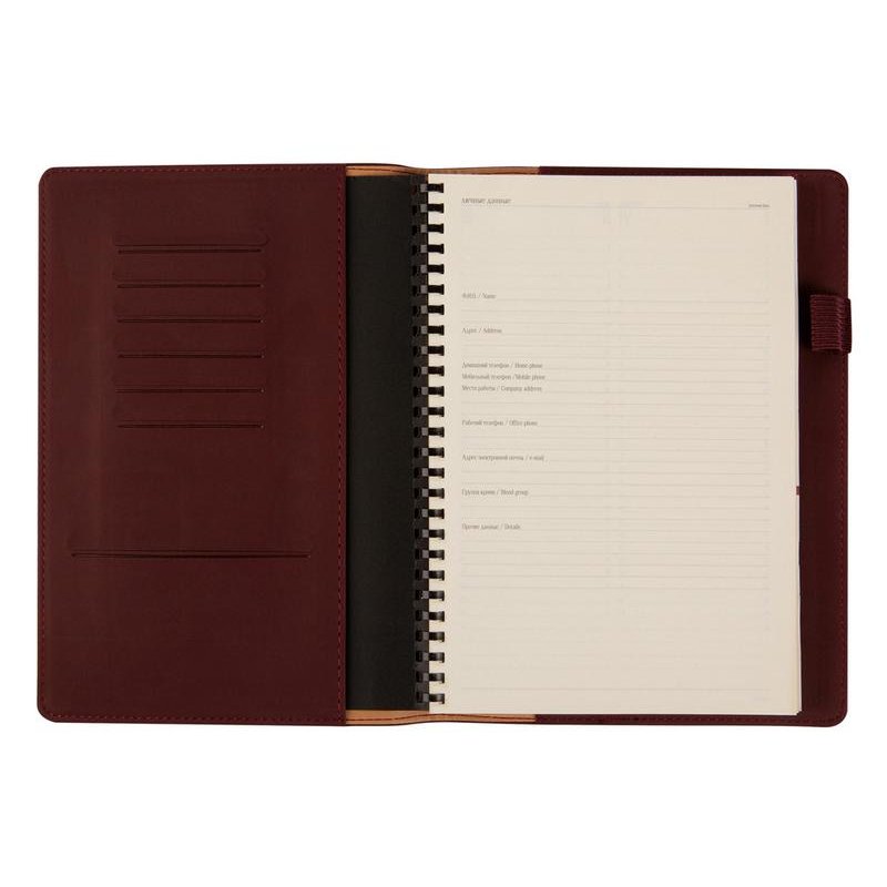 Блок является сменным и вставляется внутрь обложки. С внутренней стороны обложка имеет вырубные отделения для визиток и кредитных карт, а также петлю для ручки на резинке. Для хранения чеков, записок и бумаг внутри расположен прозрачный пластиковый конверт.