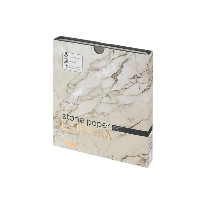Блок произведен изкаменной бумаги плотностью 144 г/кв.м, отличающейся особой гладкостью и повышенной прочностью. Она не боится воды и пролитого кофе, достаточно просто протереть сухой салфеткой.