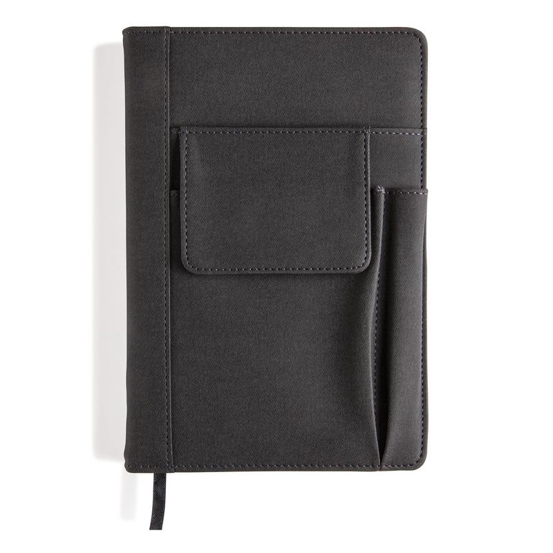 Тканевая обложка блокнота с передним отделением для телефона (14 х 10 см), с кармашком для пишущих принадлежностей и основным отделением для визиток или внешнего аккумулятора. Блокнот на 80 страниц, плотность бумаги 80 г/м2. После того как блокнот закончится, еголегко поменять на новый.