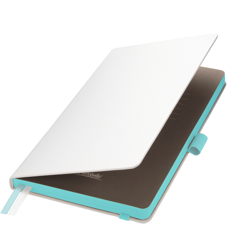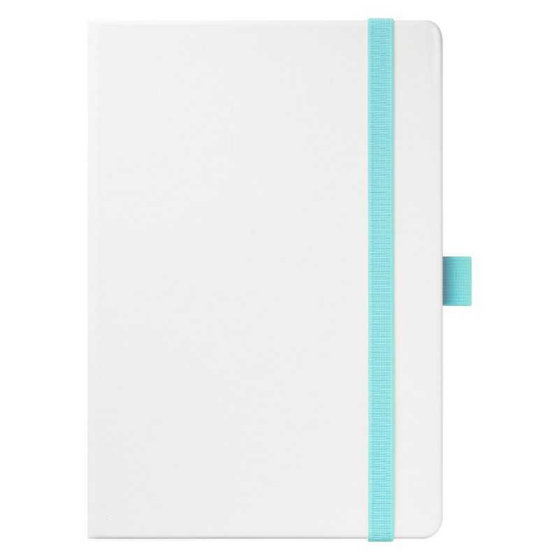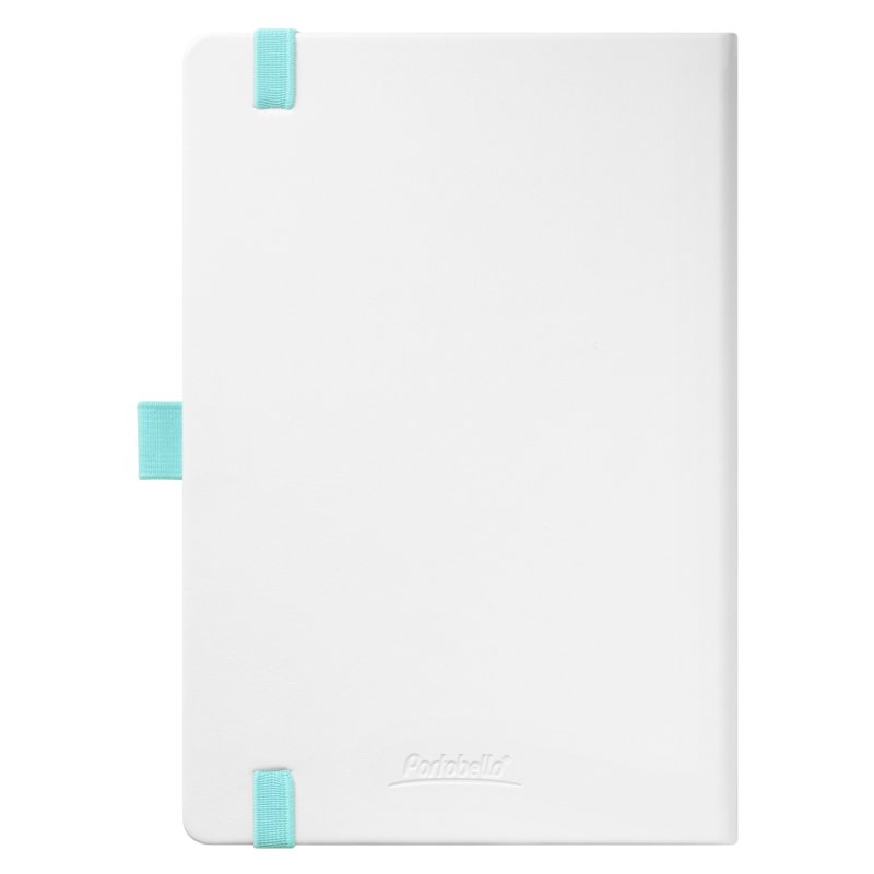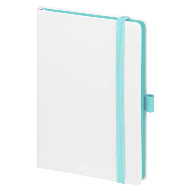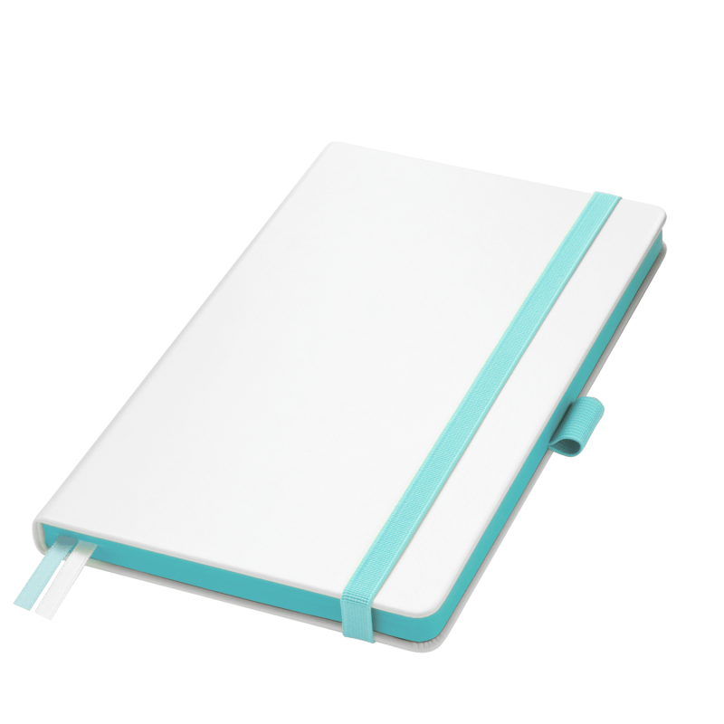 Недатированный ежедневник выполнен в жесткой обложке из искусственной кожи со скругленными уголками. Переплетный материал гладкий, с легкой естественной паутинкой морщин, имеет полуглянцевый блеск. Цвет – чистый белый. Бирюзовые матовые форзац и нахзац, а также бирюзовый срез блока создают оригинальный динамичный цветовой ансамбль и подчеркивают белизну обложки. Страницы светло-кремового цвета, из гладкого офсета, слегка шелковистые, со скругленными уголками. Добавляют изделию мягкую комфортную теплоту. Двойное атласное ляссе составлено из бирюзовой и белой лент. Каждая шириной 6 мм, имеет легкий блеск. Вертикальная фиксирующая резинка прочная, надежная и удобная, в тон срезу. Есть петелька для ручки в тон резинки. Карман на заднем форзаце.