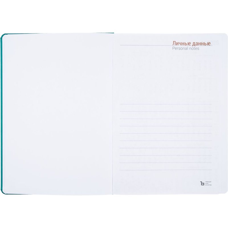 Ежедневник с твердой обложкой, выполнен из материала Latte, цвет морской волны II, дополнен ляссе в цвет обложки.