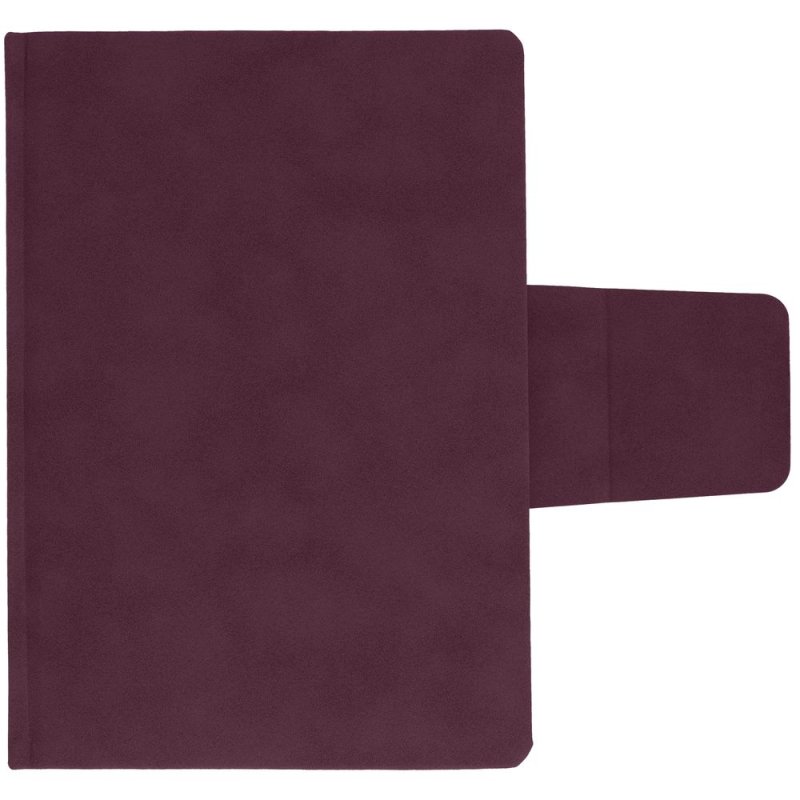 Ежедневник с твердой обложкой c поролоном, выполнен из материала Nubuck, винный SS, дополнен капталом и ляссе бордового цвета. Застежка — хлястик на магните.