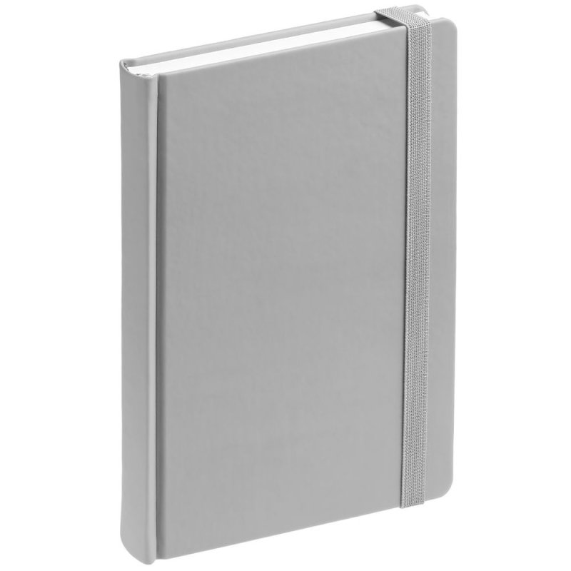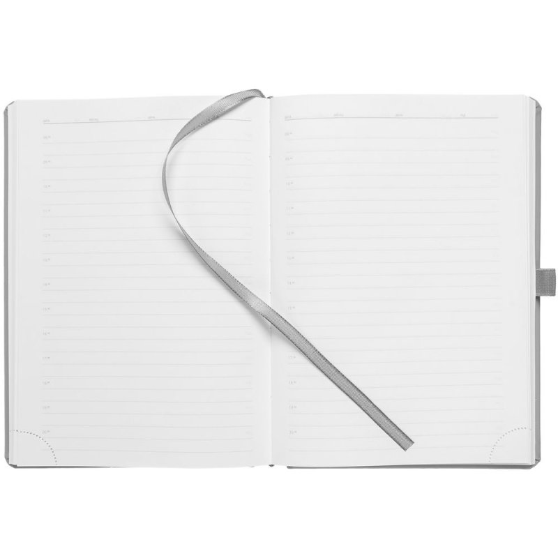 Ежедневник с твердой обложкой без поролона, выполнен из материала Soft Touch, серый СС, дополнен резинкой шириной 1 см, петлей-резинкой для ручки, капталом и ляссе серого цвета.