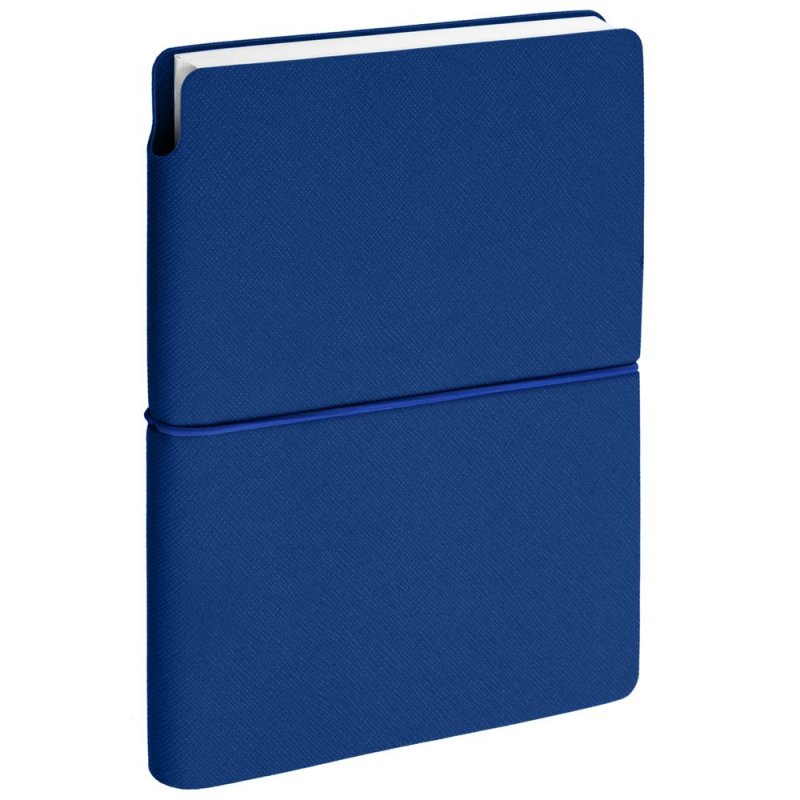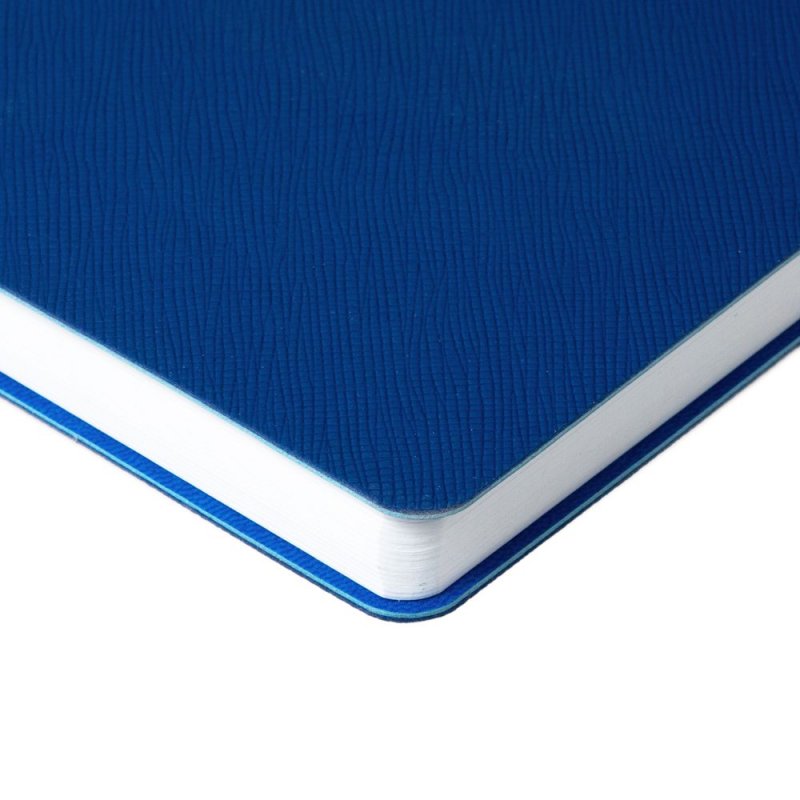 Ежедневник с гибкой обложкой выполнена из материала Nice Touch, синий и Latte, синий (внутренняя часть обложки), дополнен горизонтальной резинкой в цвет обложки. Внутри корешка — специальное место для крепления ручки размером до 15х1 см.