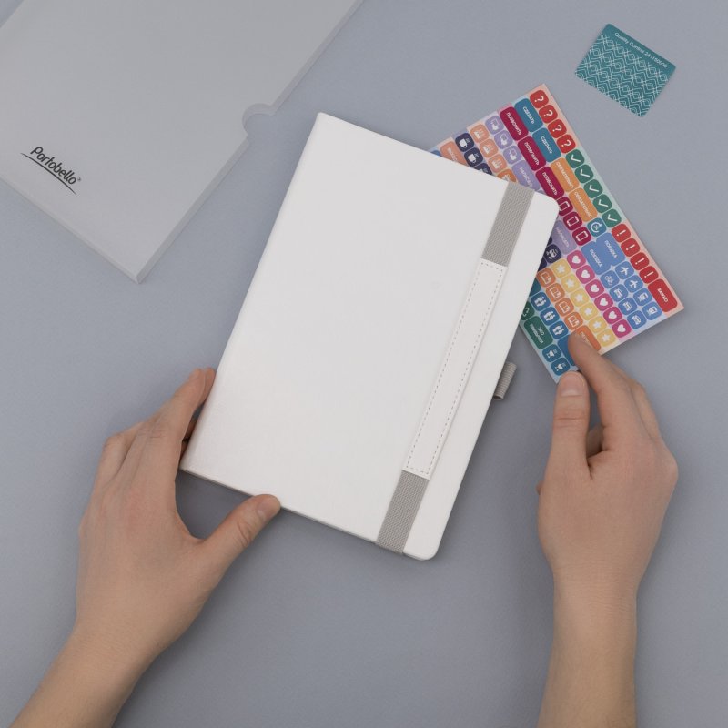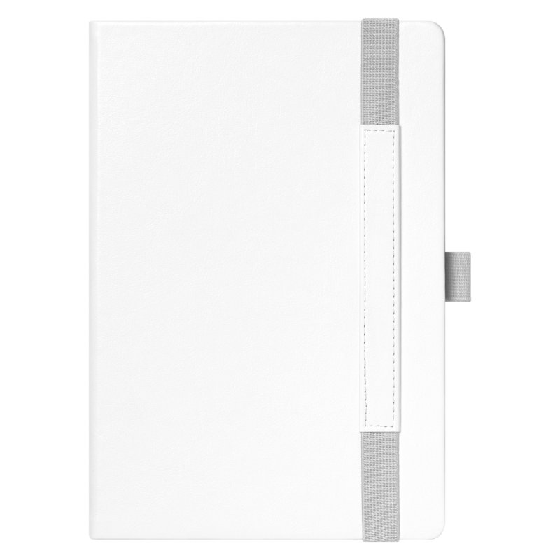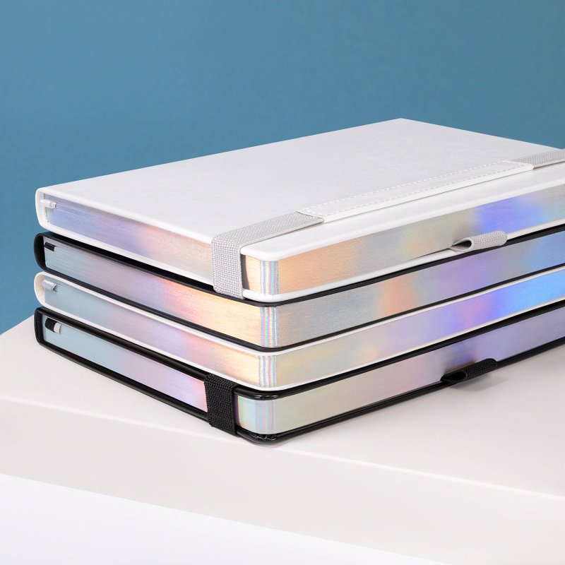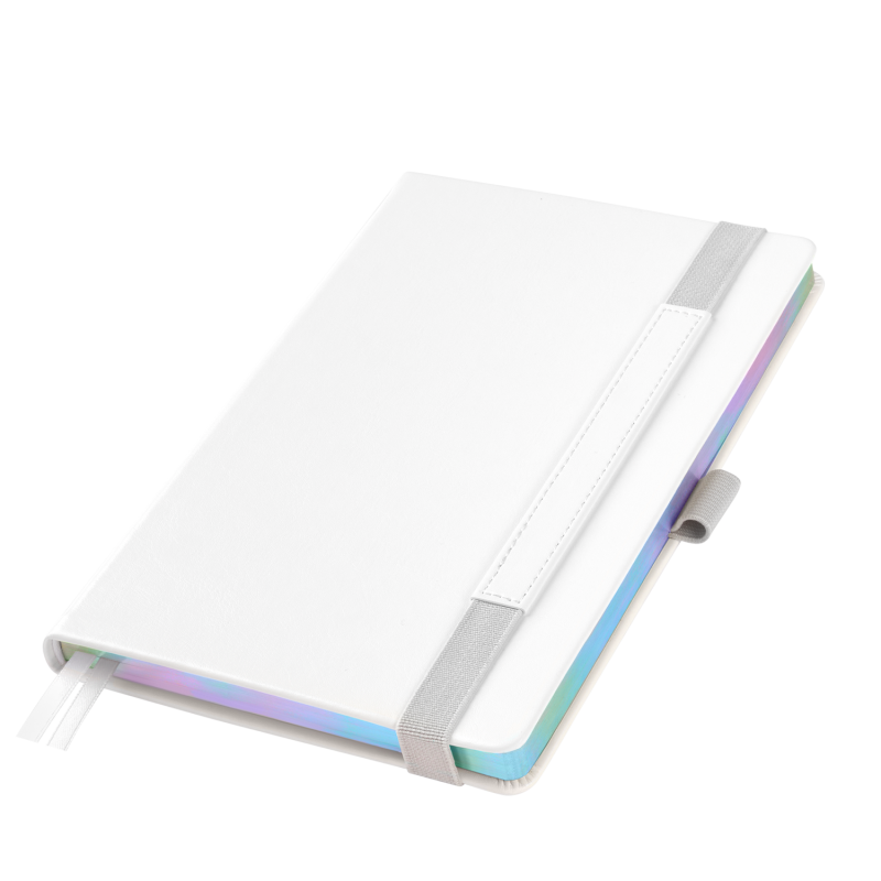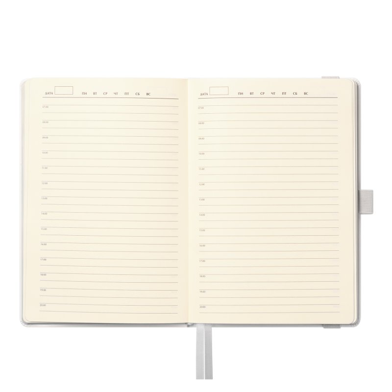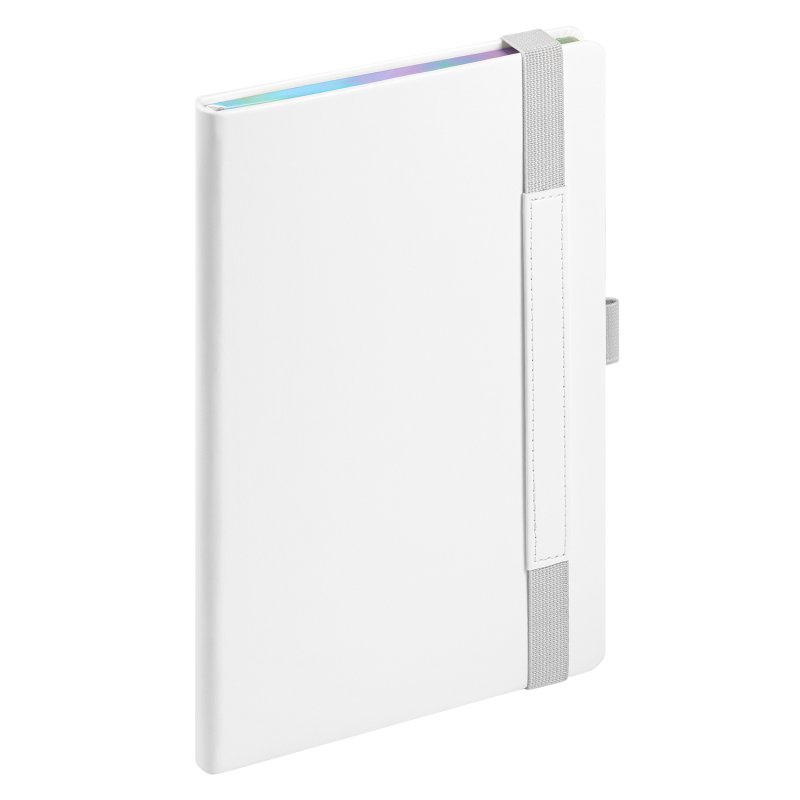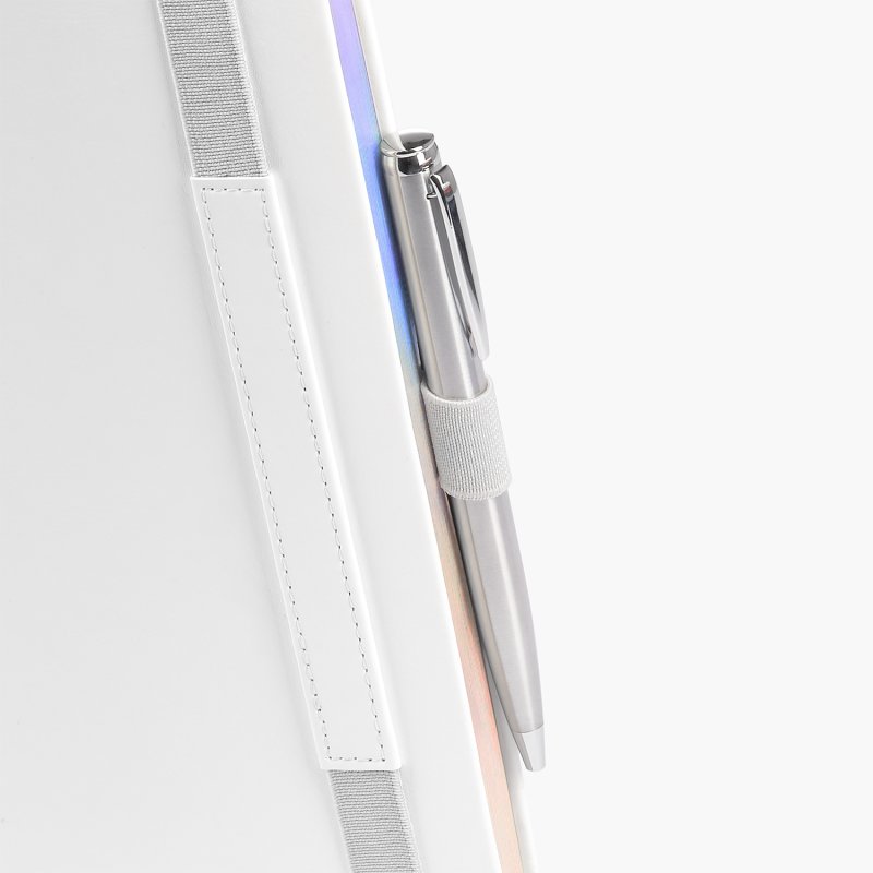 Недатированный ежедневник в жесткой обложке из качественной искусственной кожи. Материал обложки гладкий, текстурированный, с полуглянцевым блеском. Скругленные углы обложки и внутреннего блока. Отличительная особенность коллекции — голографический фольгированный срез блока. Форзац/нахзац– серые. Вариант в жесткой обложке украшен широкой вертикальной резинкой-фиксатором с вставкой из ПУ-материала обложки и петелькой под ручку, а также двойным ляссе (серым и в тон обложки).