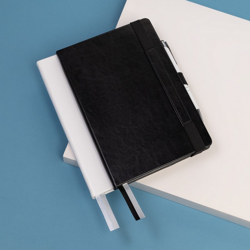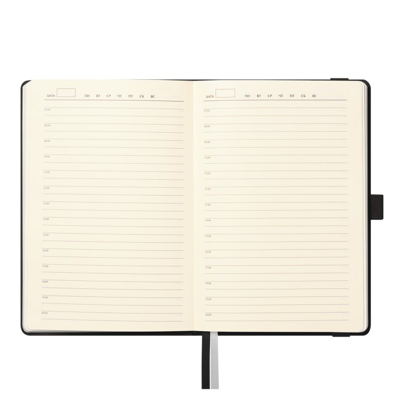 Недатированный ежедневник в жесткой обложке из качественной искусственной кожи. Материал обложки гладкий, текстурированный, с полуглянцевым блеском. Скругленные углы обложки и внутреннего блока. Отличительная особенность коллекции — голографический фольгированный срез блока. Форзац/нахзац– серые. Вариант в жесткой обложке украшен широкой вертикальной резинкой-фиксатором с вставкой из ПУ-материала обложки и петелькой под ручку, а также двойным ляссе (серым и в тон обложки).