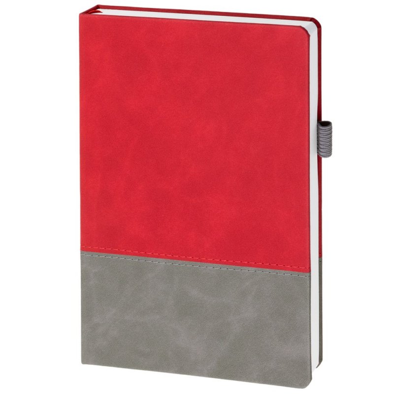 Ежедневник с твердой обложкой, без поролона, со сшивкой материалов Nubuck Touch, серый СС, и Nubuck Touch красный РР, дополнен двойным ляссе и петлей-резинкой для ручки.