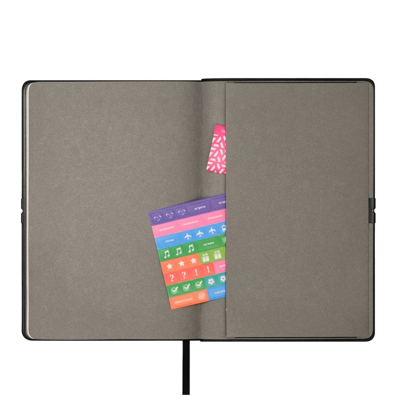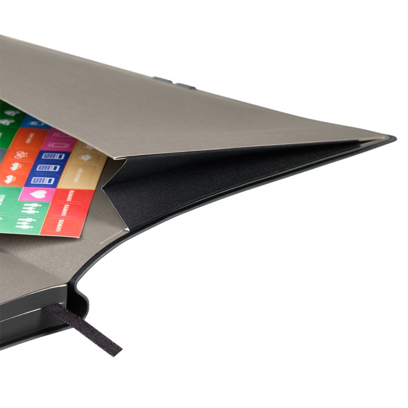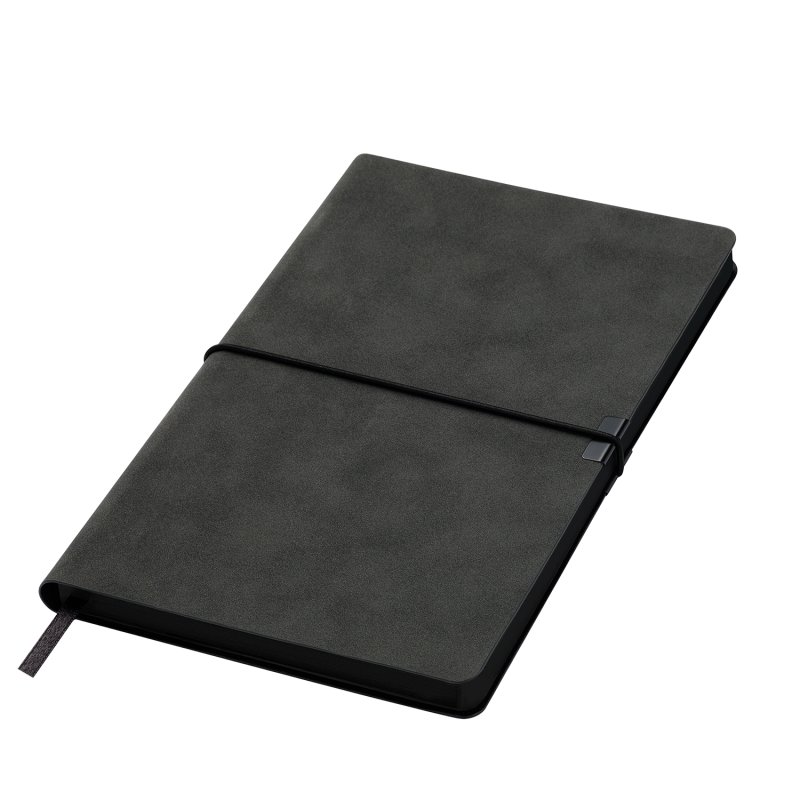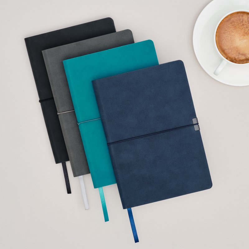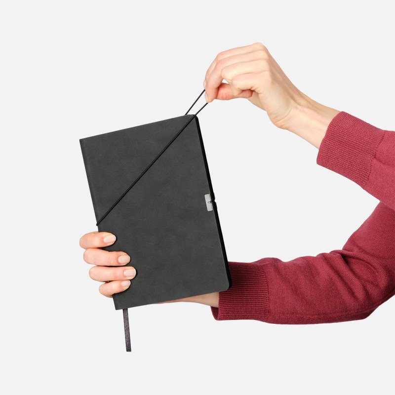 Горизонтальная резинка, фиксирующая обложку, дополнена металлическими элементами, которые не только защищают обложку от повреждений, но и служат стильным акцентом. Матовый срез в тон обложки и светло-кремовые страницы из гладкого, слегка шелковистого офсета подчеркивают изысканность дизайна. Атласное ляссе гармонично завершает образ этого элегантного ежедневника.—