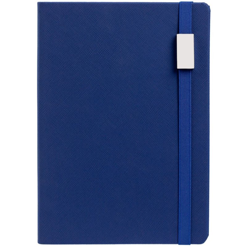 Ежедневник с полутвердой обложкой выполнен из материала Nice Touch, синий НН, и дополнен резинкой шириной 1 см с металлическим шильдом и ляссе синего цвета.